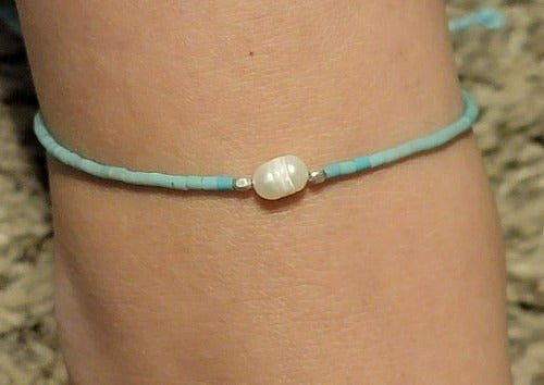 Take a bit of the sunshine with you all year round with a vibrant Matira pearl anklet. Ethically produced anklet threaded with tiny beads and centered with a freshwater pearl.