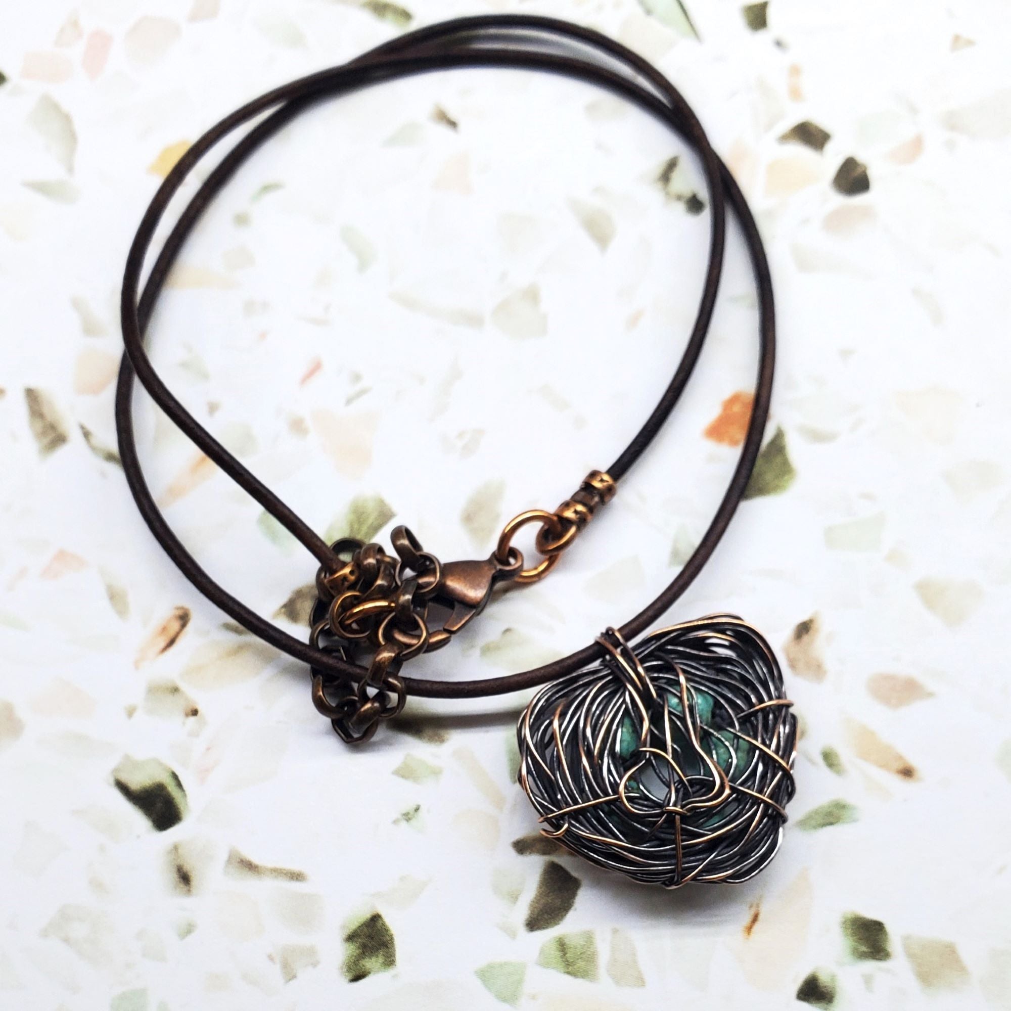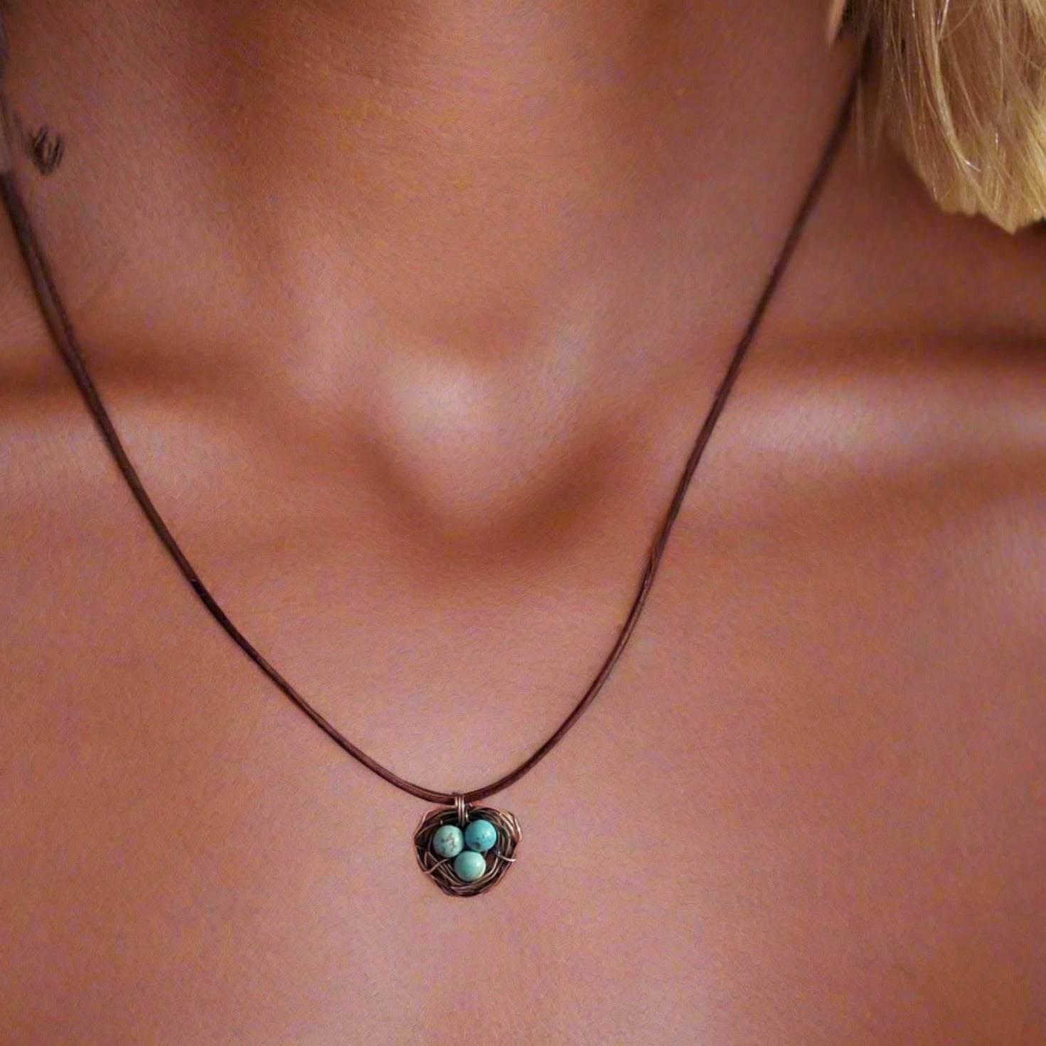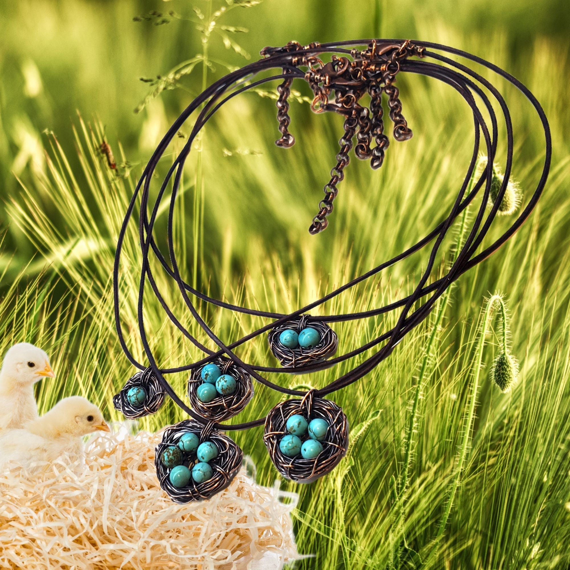 Handcrafted with love and passion, this unique nature resembling necklace features a beautiful wire-wrapped robin's nest with up to 5 beads.  Create a meaningful connection with my Handmade Wire Wrapped Robin Nest Necklace. Each necklace is carefully handcrafted with up to 5 speckled turquoise beads, representing the unique bond a mother has with her child or children.  The nests grows in size with the number beads (children) added, so does the nest in my necklace as well. The genuine leather necklace adds a touch of rustic charm to the 16 inch length, which can be extended by 2 inches. Keep your loved ones close to your heart with this one-of-a-kind accessory! Nature lovers feel free to indulge with this nature representing beauty.