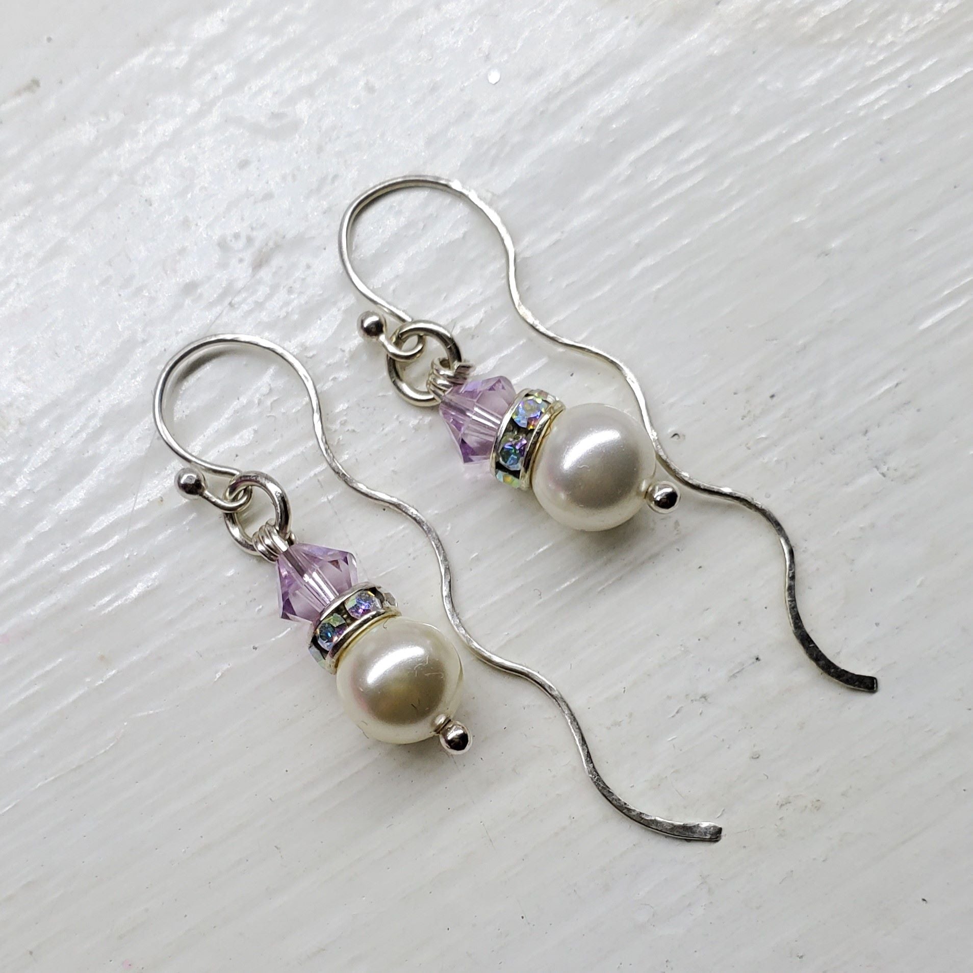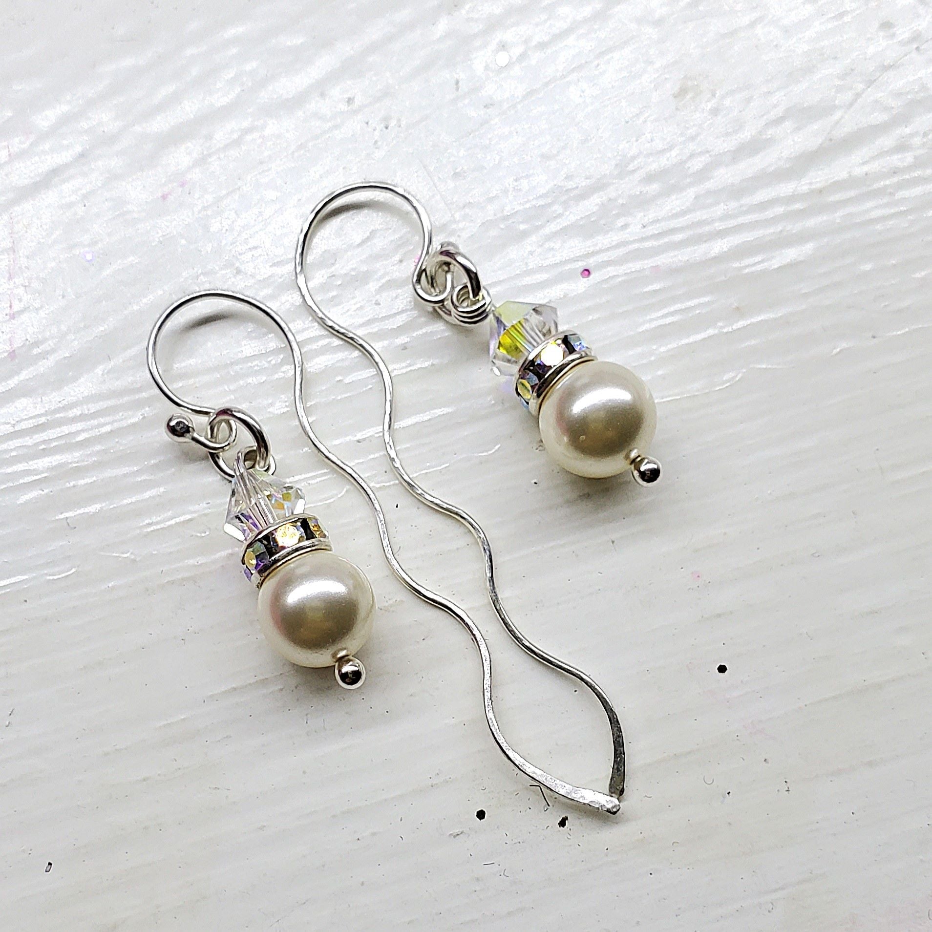 Elevate your daily look with our Ergonomic Crystal Pearl Wavy Ear Threaders available in a few fashionable colors. Combining the elegance of Swarovski pearls with the modern touch of an ergonomic hammered patterned wavy ear wire design, These sturdy threaders add a unique flair to any of your outfits. Embrace your inner fashionista and feel effortlessly stylish while wearing these. The length of the dangle is 1 1/4 inch. The ear wires have a length of about 2 inches These sterling silver ear wires were designed with science in mind to make daily things easier, by eliminating the need for stoppers.