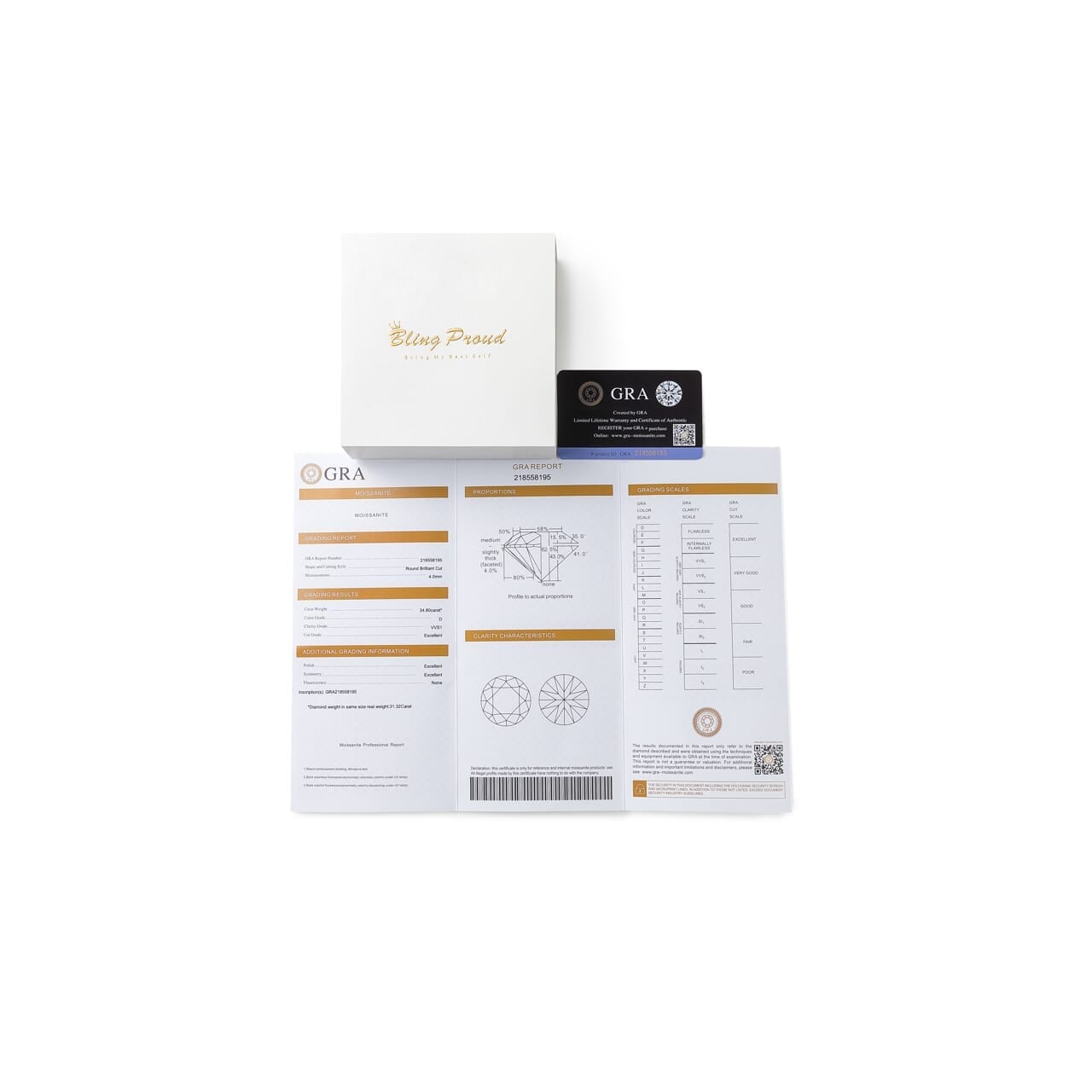 A pair of earrings, a gift box, a warranty card, a GRA moissanite report