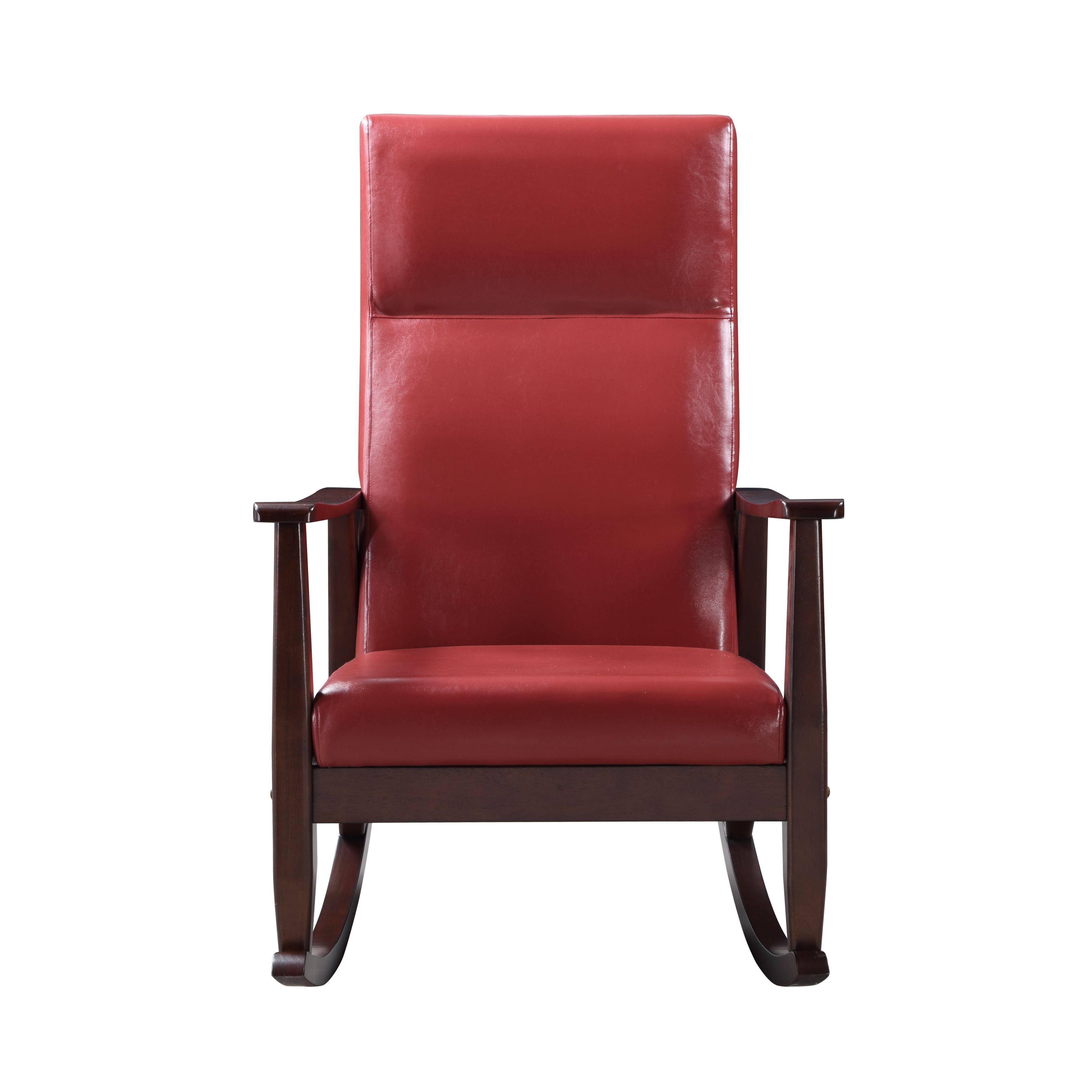 - Elegant Design: This rocking chair features smooth synthetic leather upholstery in two sophisticated colors, red and dark brown, paired with an espresso-finished frame for a rich and stylish appearance.