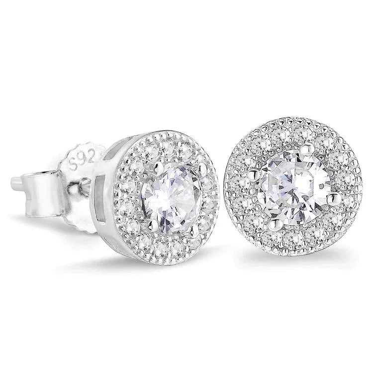 These silver round earrings flooded in handset stones. The border layer draws attention to its large center stone, making it the perfect complimentary piece to any of our iced out products. This pair of earrings is made from pure 925 Silver with white gold or 14k gold plated. Their polished finish reflects light and adds an elegant touch of sparkle that makes them an ideal choice for special occasions. They come in a comfortable butterfly fastening for a secure fit.