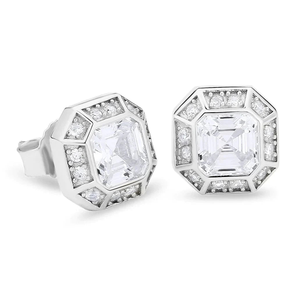 These earrings feature an emerald cut diamond, with outer part fully iced with high-quality CZ diamond stones. Made of sterling silver, they're classy, allergy-safe, and perfect for any occasion.