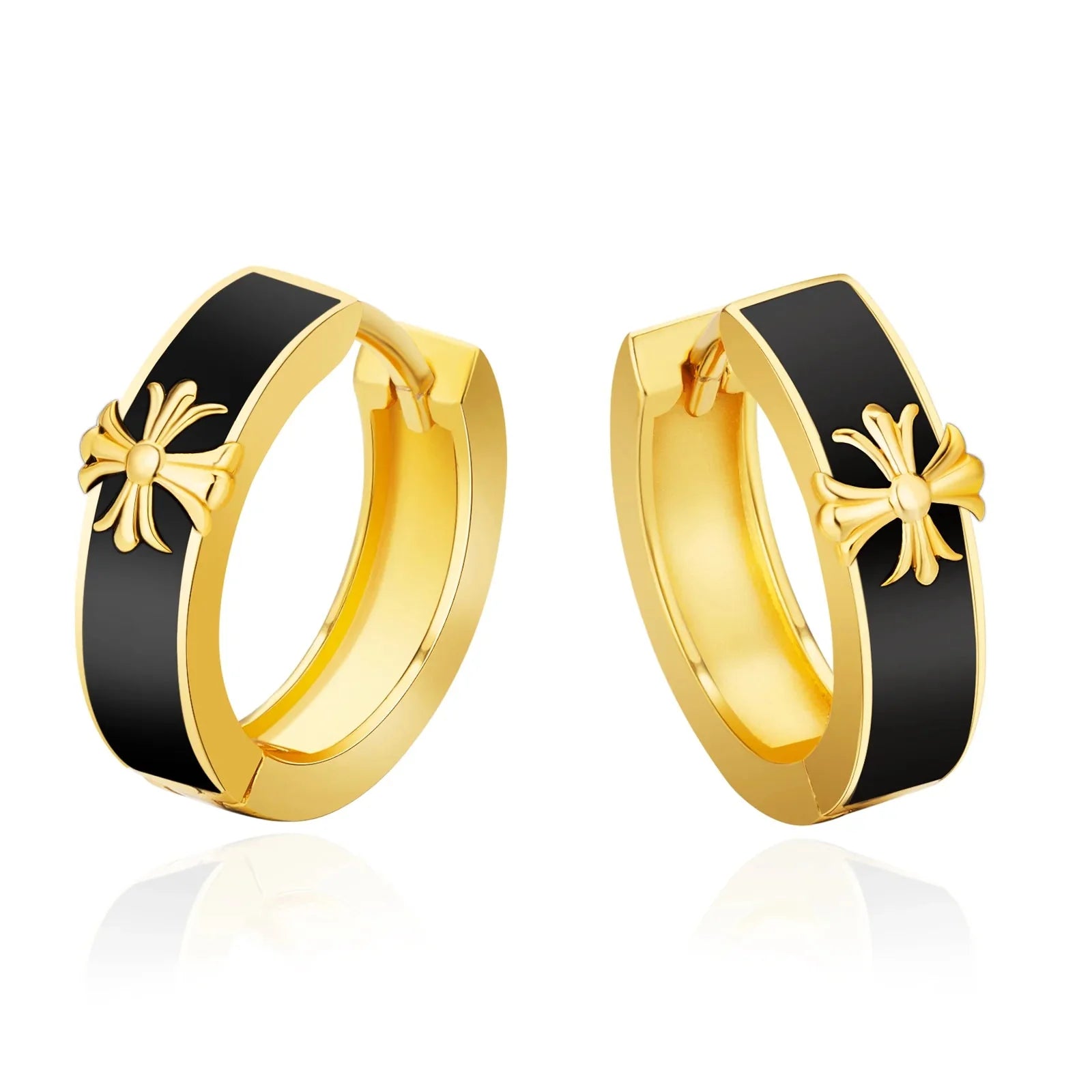 Fulfilled by our friends at Bling Proud | Urban Jewelry Online StoreAdd some flare to your fashion game with Bling Proud's 15mm S925 Silver Black Enamel Cross Hoop Earrings in 14K Gold. These earrings boast a chic and intricate Cross design that will amp up any look with a spark...