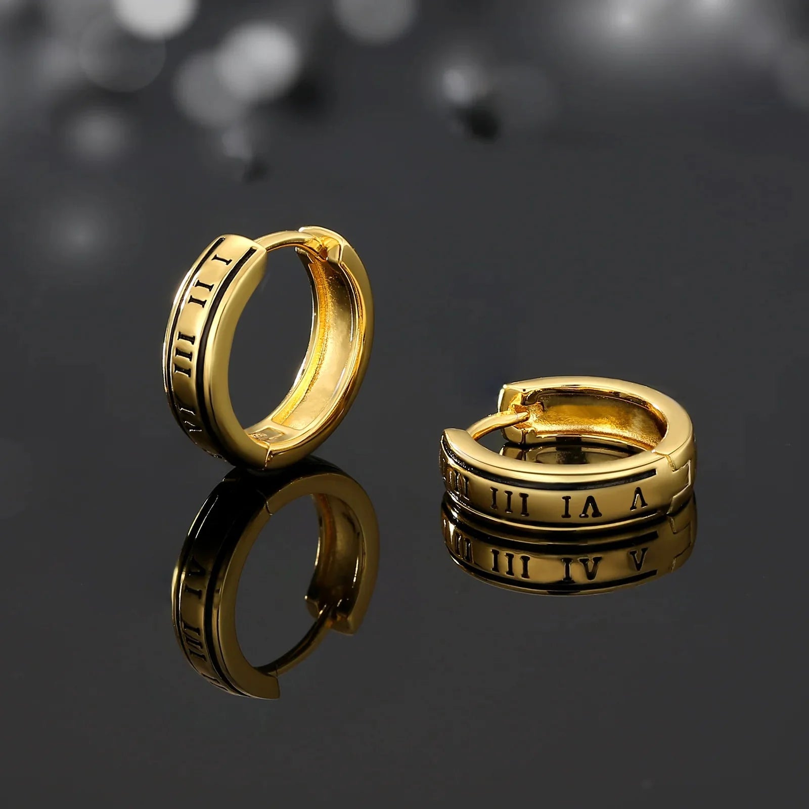 Step up your style status with our S925 Silver Black Roman Numerals Hoop Earrings in 14K Gold - 15mm. The best of both worlds - a mix of timeless and trendy! Not to mention, they're hypoallergenic and safe for all skin types. Made with 925 pure sterling silver and coated in 14k gold for a touch of luxury. Perfect for any occasion!