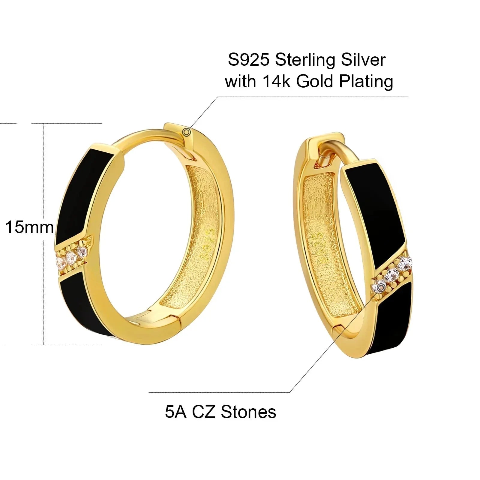 Women's S925 Diamond Black Hoop Earrings in 14K Gold - 15mm by Bling Proud
