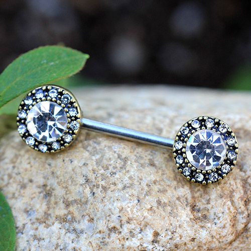 Fulfilled by our friends at Fashion Hut Jewelry• Nipple Bar / Nipple Jewelry with Multiple CZ• A large round Clear CZ surrounded by multiple small Clear CZ• Antique gold plated jewelry• Bar Thickness : 14GA | 1.6mm• Bar Length : 9/16" | 14mm• Round Design Size : 9.5mm• Thread Type...