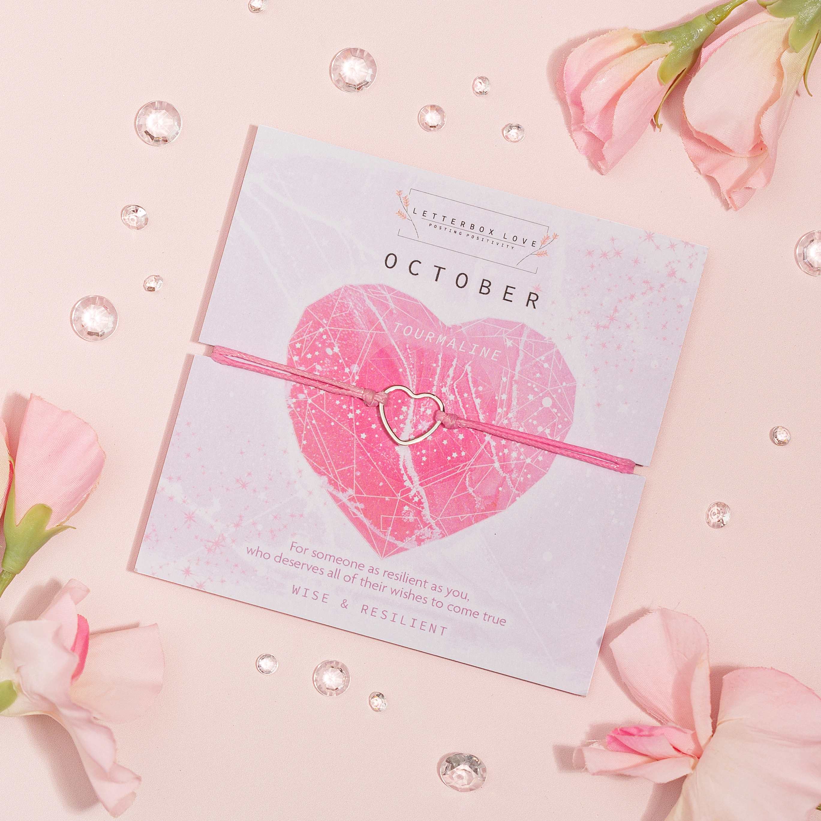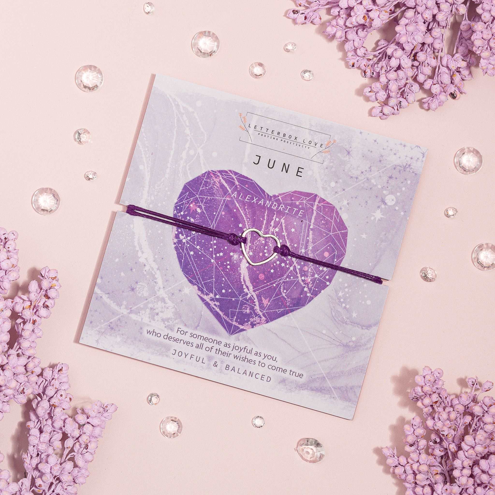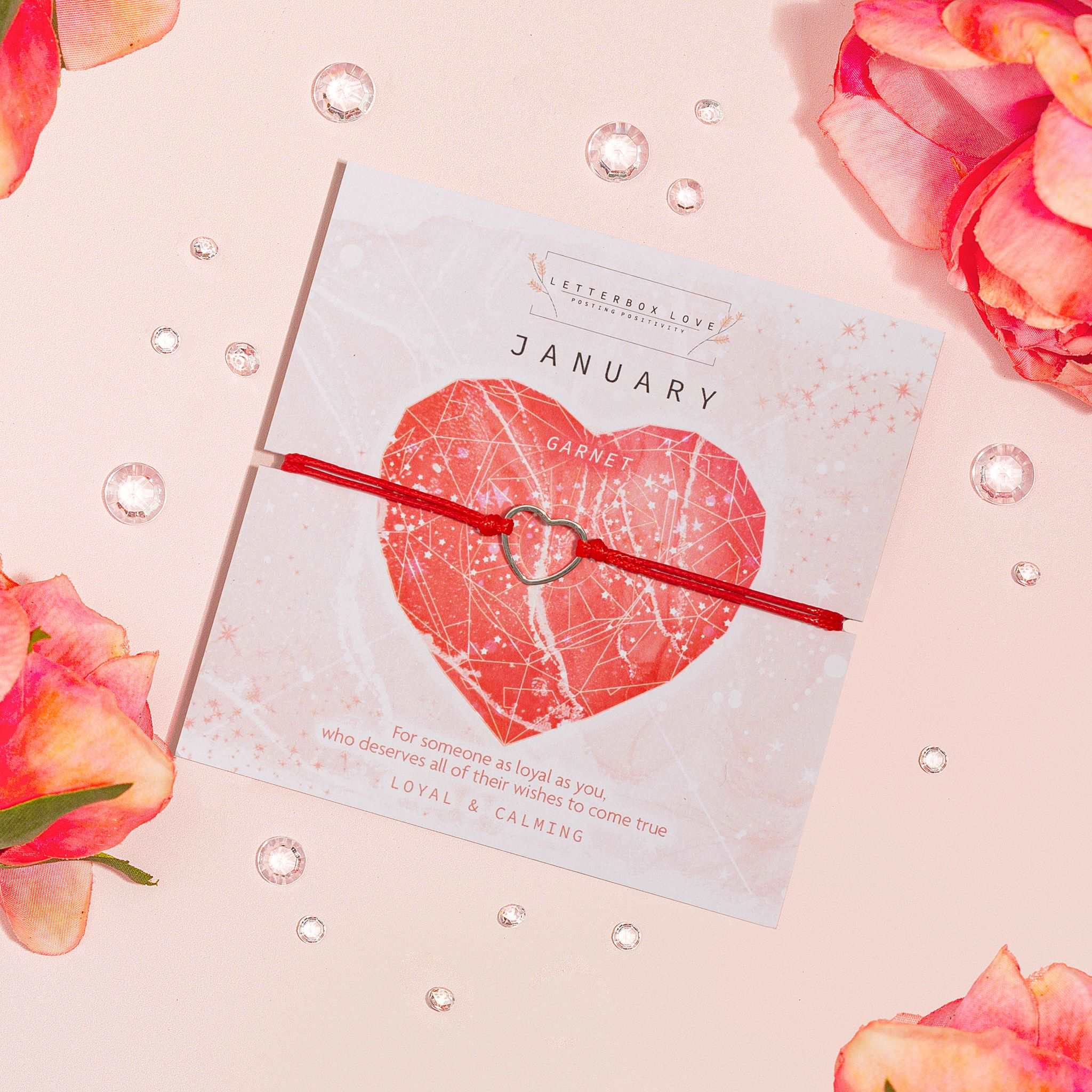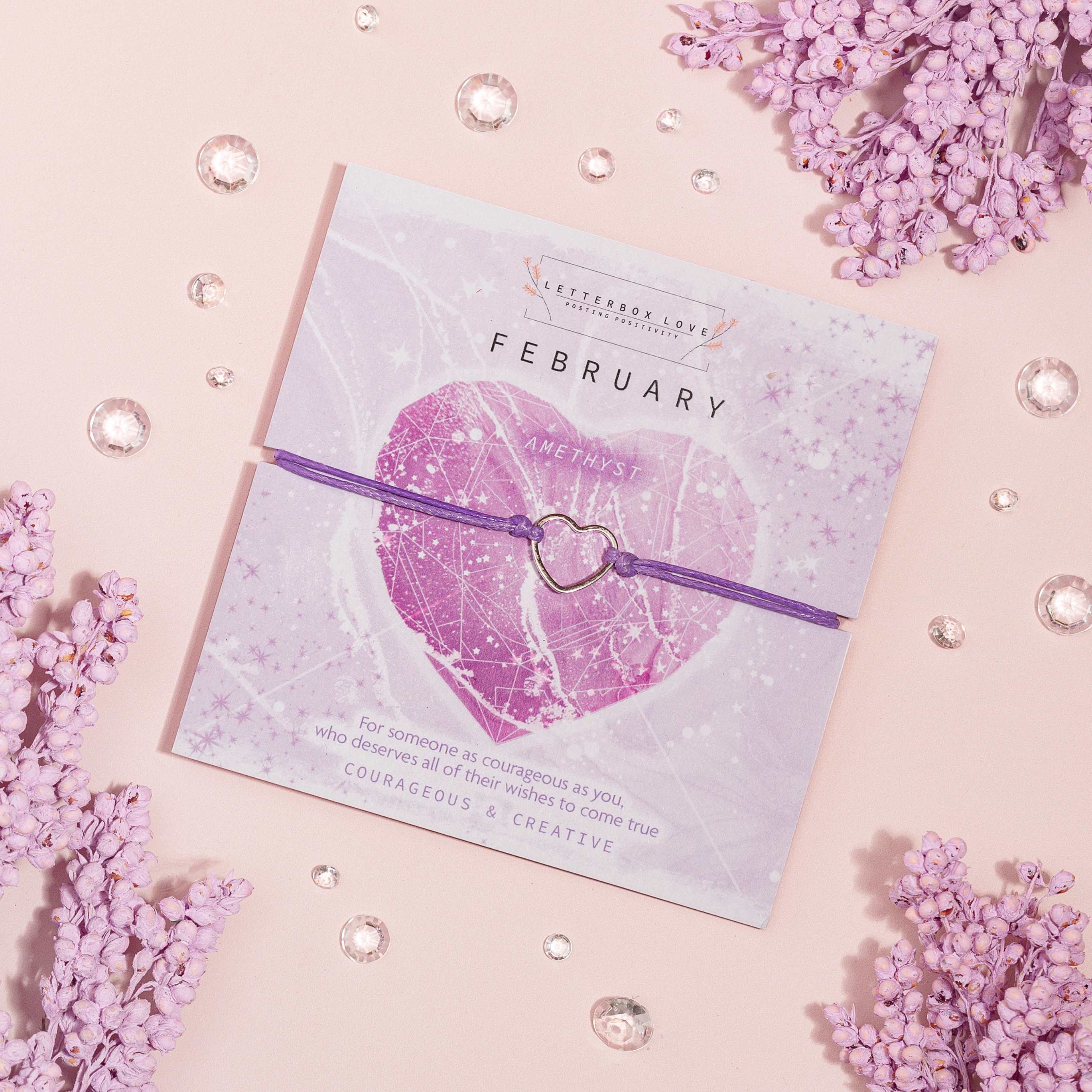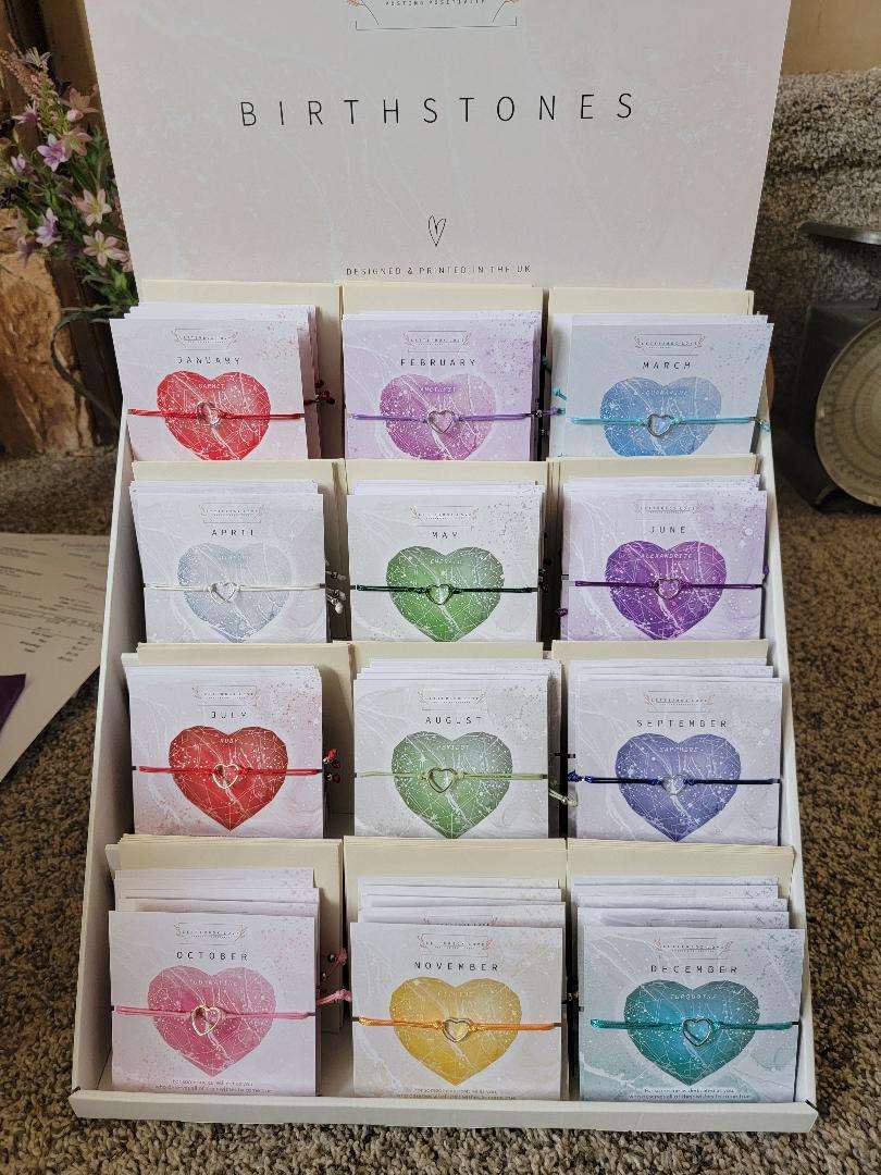 A vibrant collection of birthstone wish bracelets, each month showcasing a dazzling birth stone print and a dainty hollow heart adjustable string bracelet. For a cute and affordable gift that is perfect for stocking stuffers or any occasion.