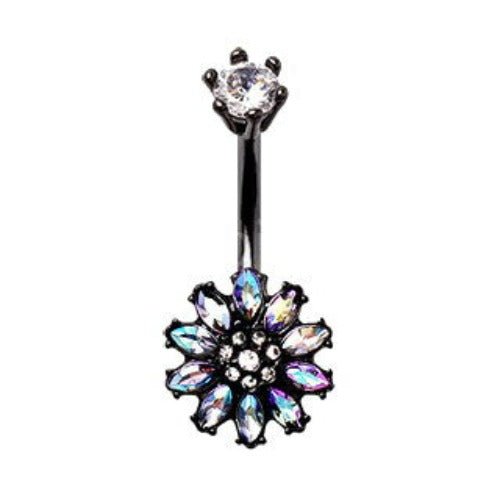Fulfilled by our friends at Fashion Hut Jewelry• Navel Ring / Belly Button Ring with a Flower Design• Black PVD plated jewelry• Multiple marquise cut Aurora Borealis CZ as flower petals• Multiple round Clear CZ in the center of flower• Prong set round Clear CZ on the top• Bar Thickness...