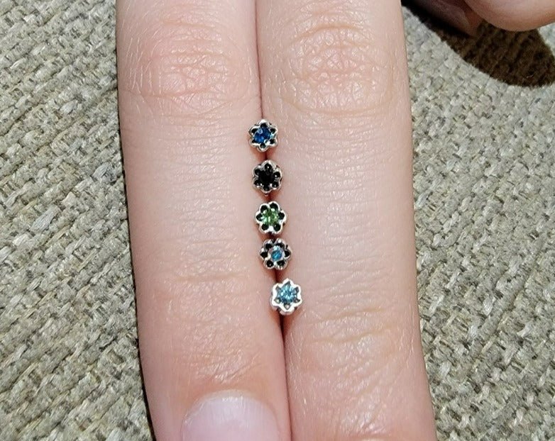 Crystal Flower Nose Bone features a 20 gauge sterling silver flower with a brilliant colored crystal prong-setting