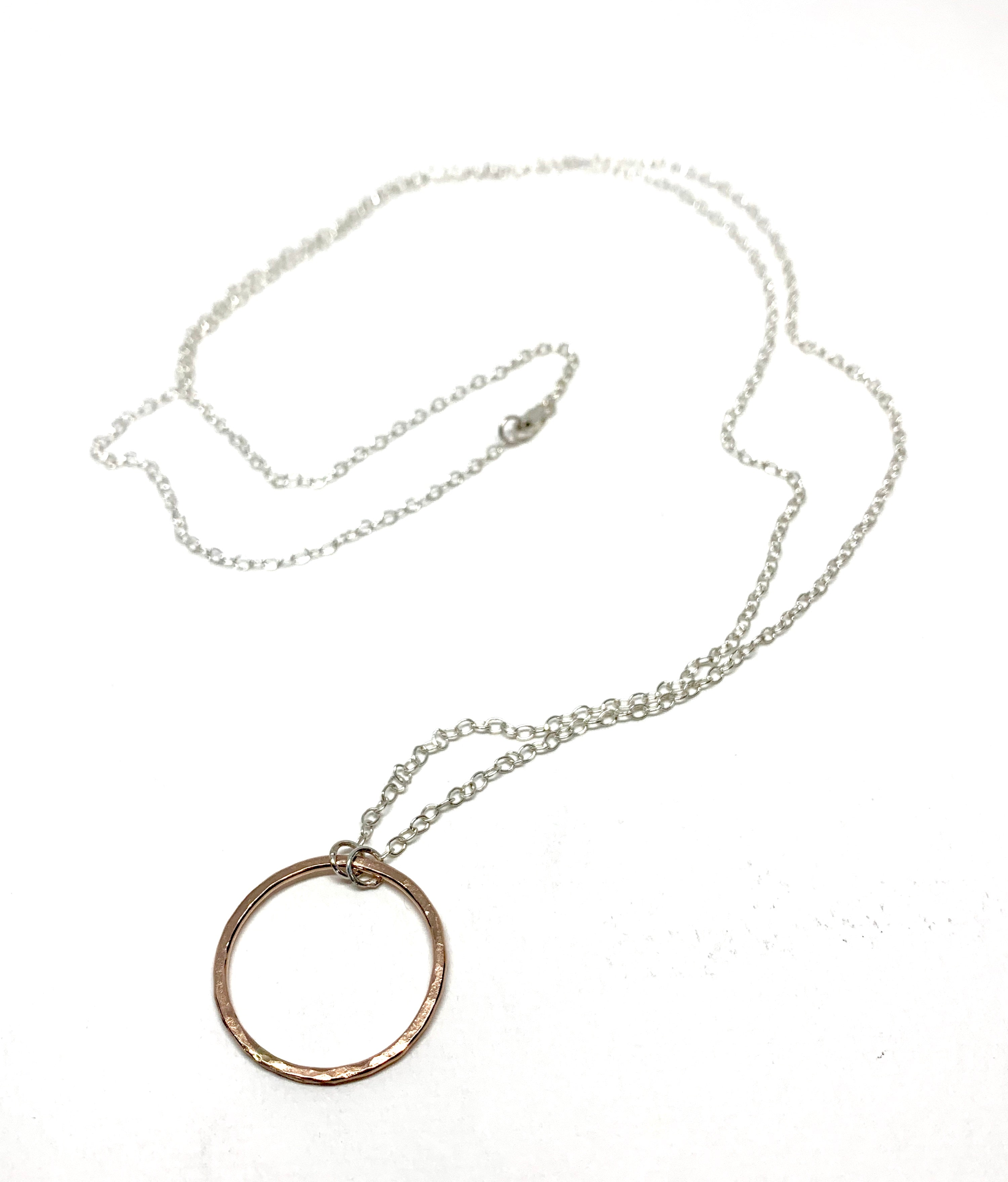 Your choice of sterling silver, yellow gold fill, or rose gold fill for the circle holder. Circle holder charm is lightly hammered for texture and is approx 1 inch wide.
