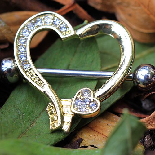 Fulfilled by our friends at Fashion Hut Jewelry• Nipple Shield / Nipple Ring with a heart design• Yellow gold plated jewelry• Heart shaped an arrow with multiple Clear CZ throughout• Barbell Thickness : 14GA | 1.6mm• Barbell Length : 3/4' | 19mm• Heart Inner Diameter (Wearable Size) : 9/16" |...
