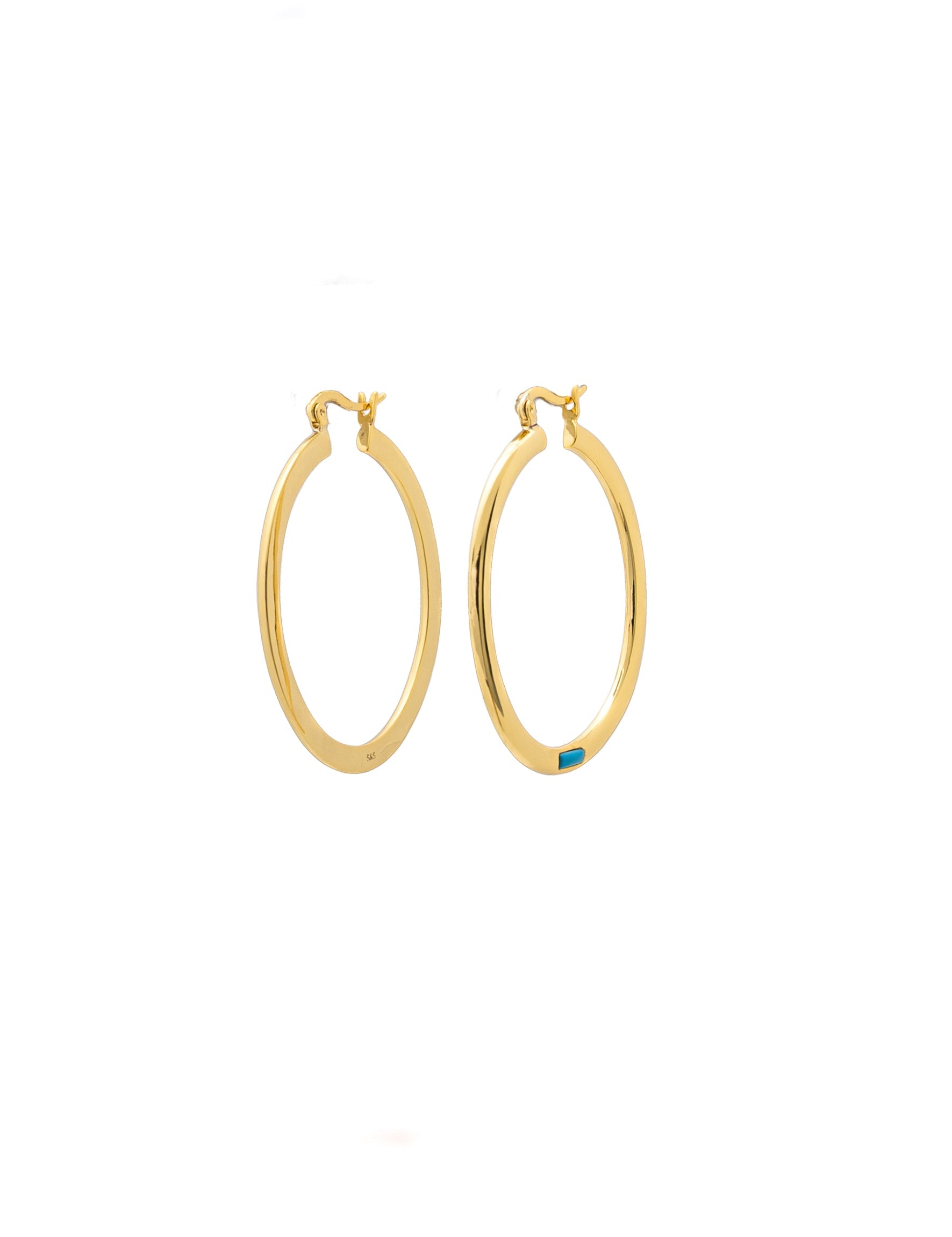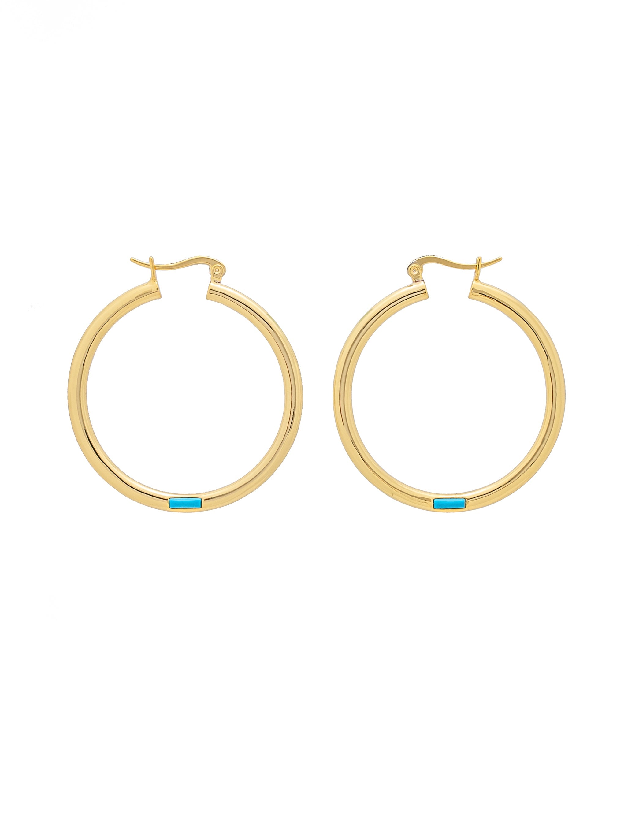 Fulfilled by our friends at Short & Suite In our Turquoise color way! Description: This lightweight hoop is made from polished gold-plated brass with our signature S&S stone. Inspired by Goldie Hawn and her iconic style. Drop: 45mm Width: 2.1mm Lightweight not heavy on the ear Metal: Polished gold-plated brass with tiny...