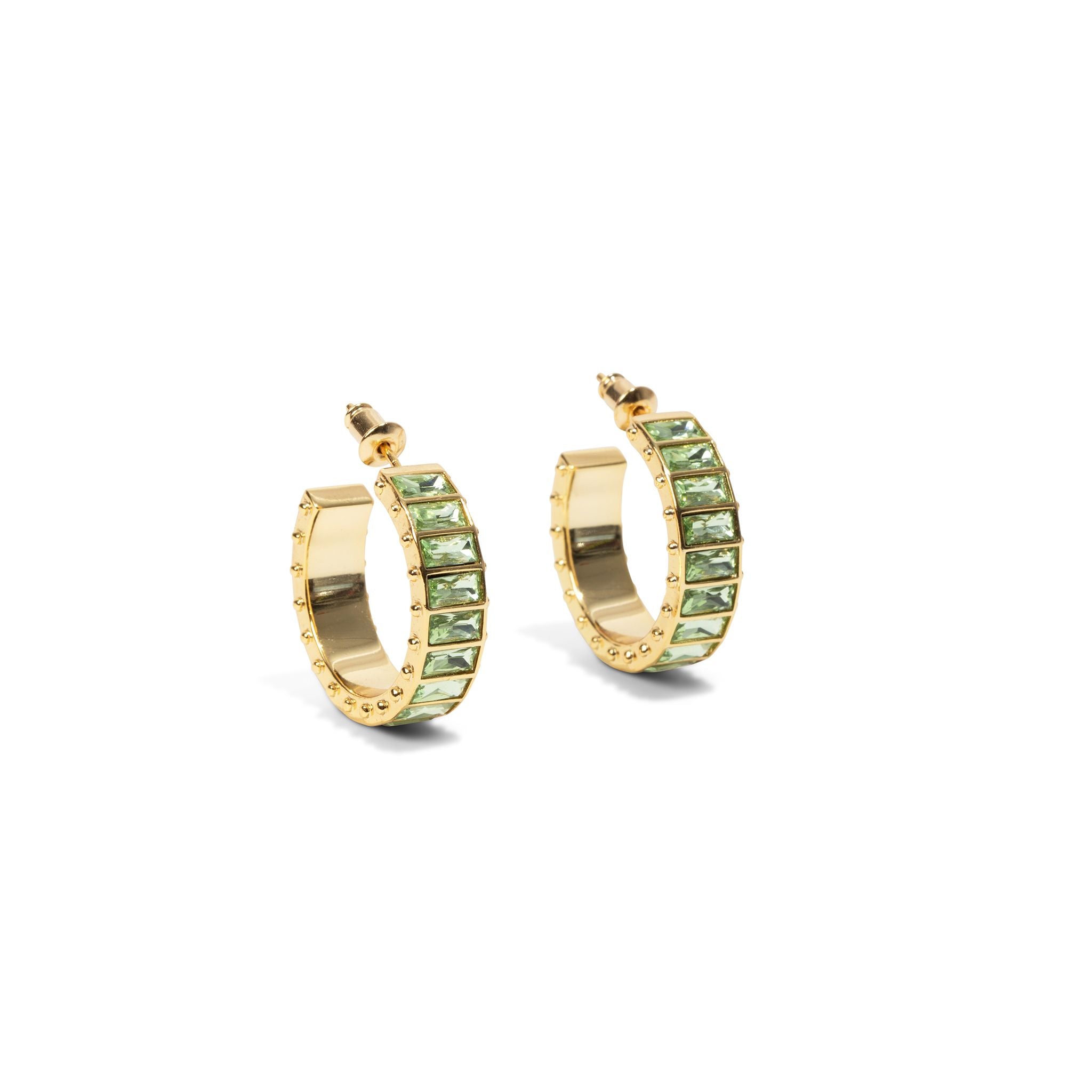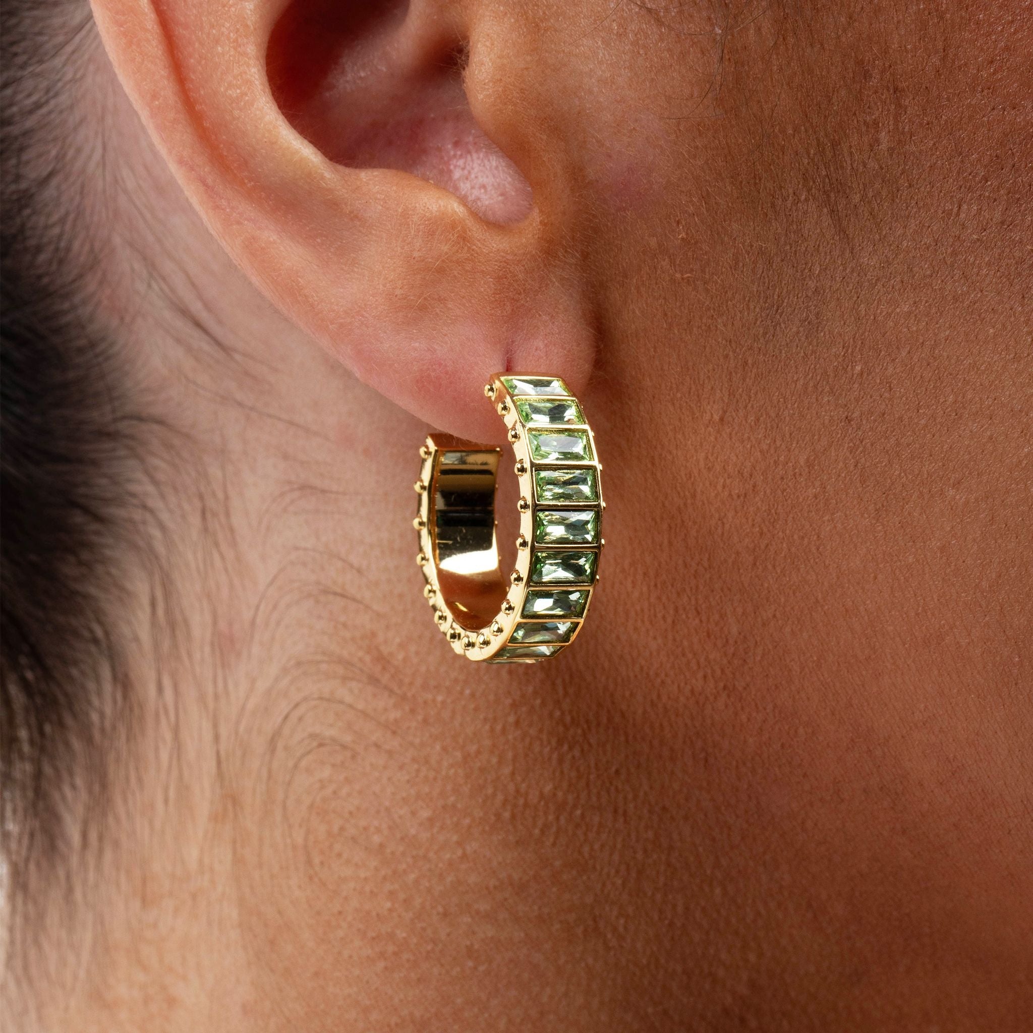 Fulfilled by our friends at Short & SuiteUpgrade your hoop game with our Medium Eternity Gem Hoop in our Iridescent Light Green Color Way. Bold and bright, it's the ideal gift for everyone on your “nice” list. *Sold as a pair Measurement: 25mm Metal + Materials: 14k gold plating over brass, Swarovski...