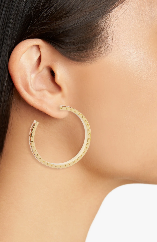 Metal + Materials: 14k gold plating over brass, Swarovski gems circle the entire hoop