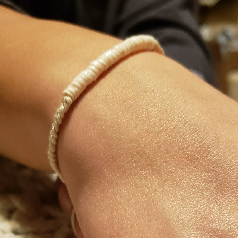 • Bracelet made with cotton cords, coconut shell clasps, dainty puka shell beads, and lots of positive vibes.