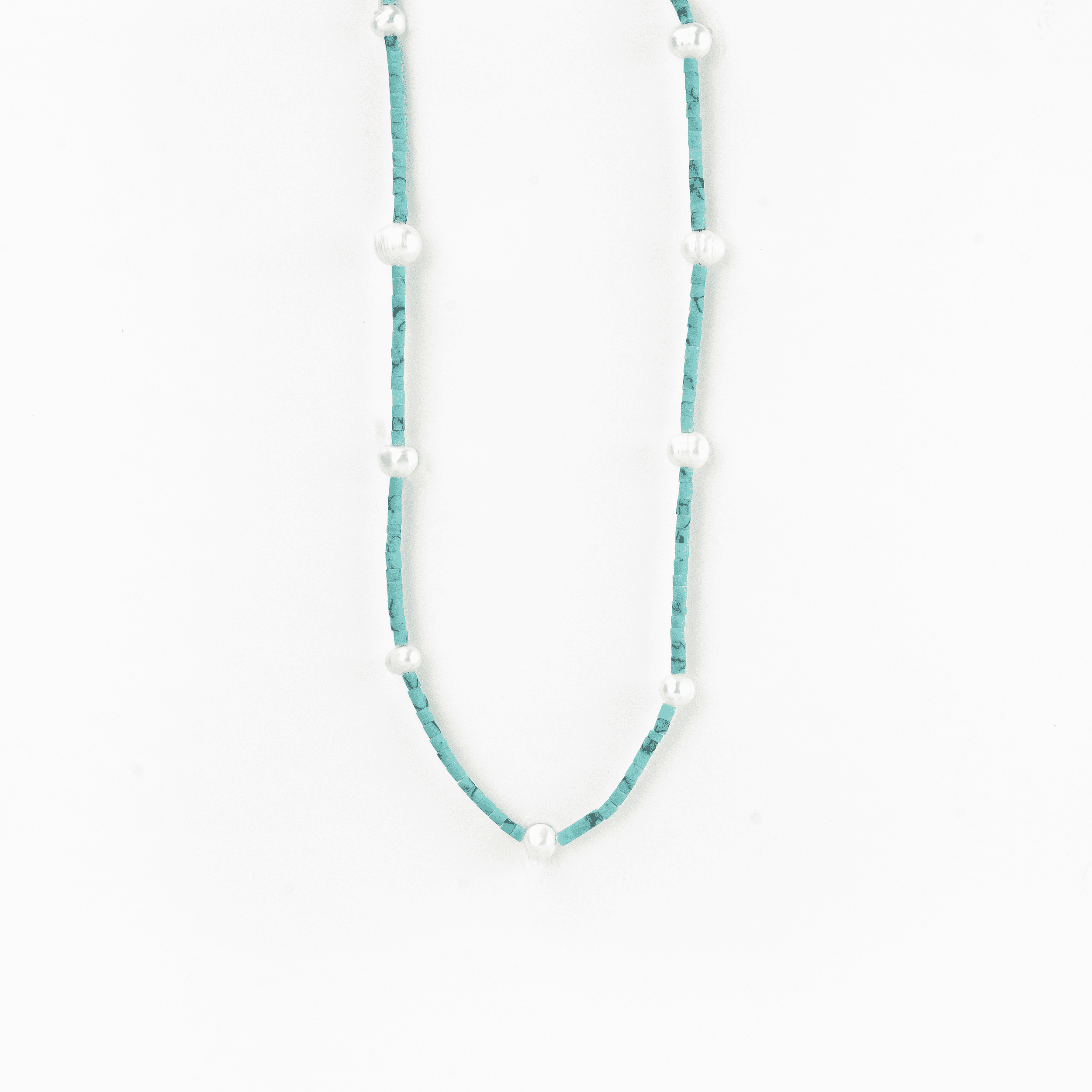 Fulfilled by our friends at Fashion Hut JewelryThis ocean-inspired Meribella pearl choker necklace is the perfect wardrobe addition. A minimal and unique fashion statement. Afghan turquoise beads adorned with real freshwater pearls. Silver-plated fastening. 16" handmade choker necklace with a 1.5" extendable chain. Real freshwater pearl beads. Afghan stone beads....