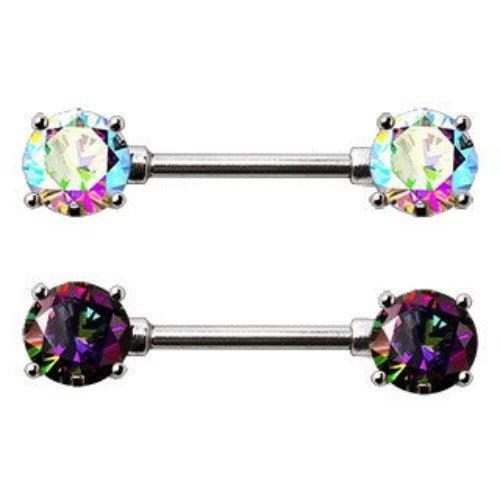 Pair 316L Stainless Steel Prong Set Iridescent Cubic Nipple Bar by Fashion Hut Jewelry