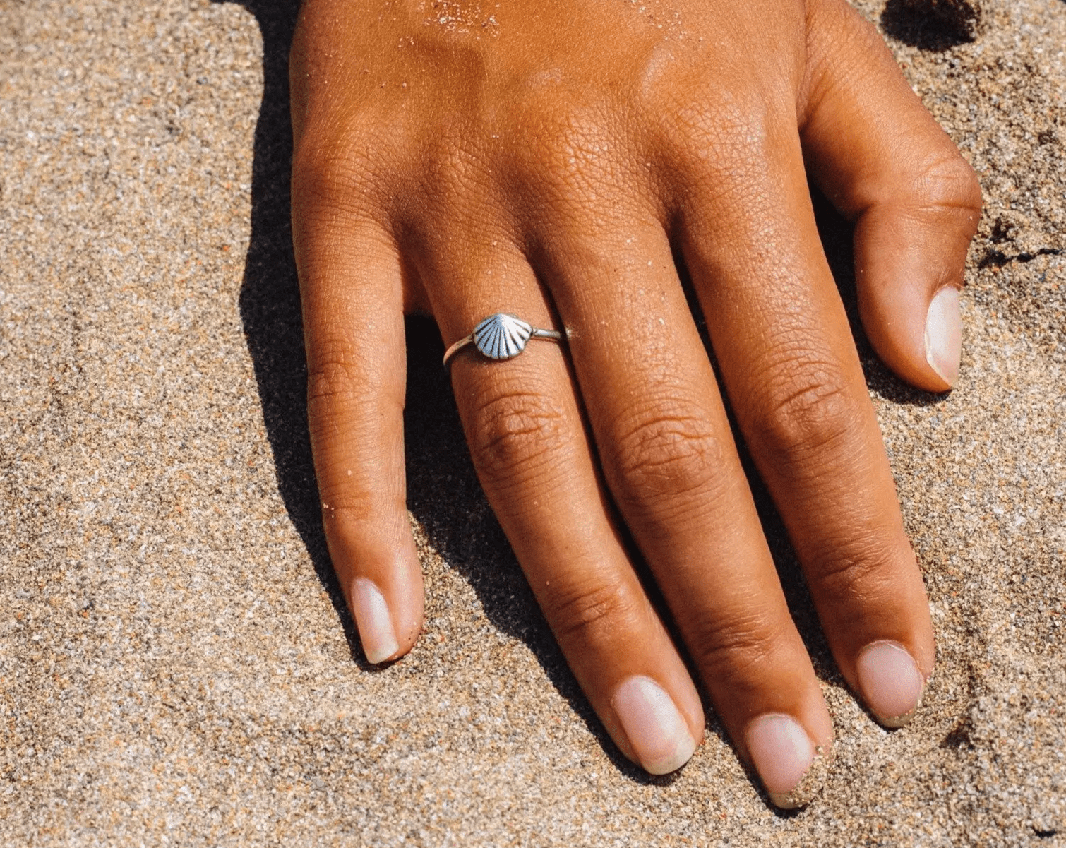 Worn solo or stacked up, our handmade adjustable ring brings a touch of the beach to your everyday style. Faux silver shell ring