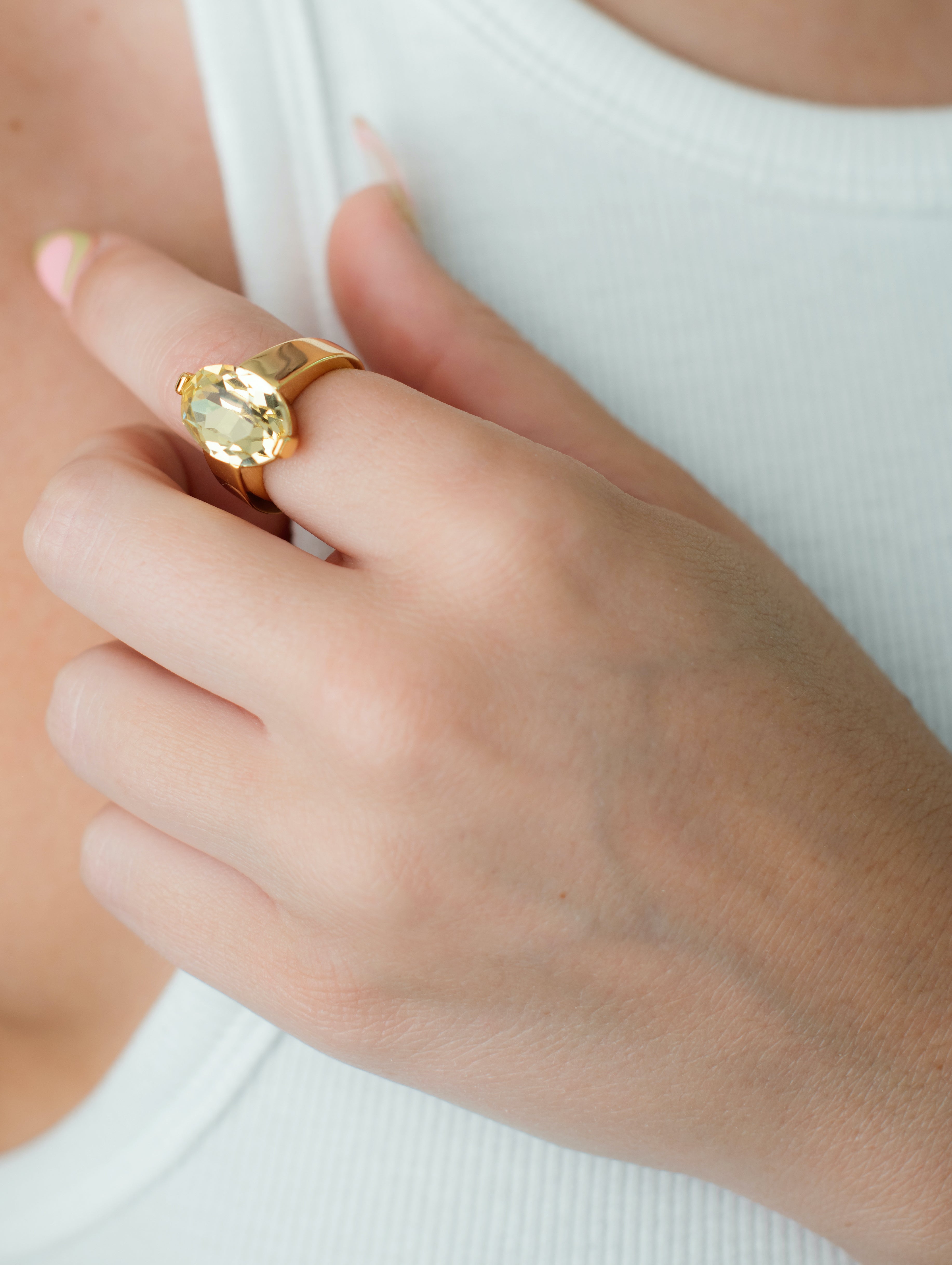 Fulfilled by our friends at Short & SuiteBack by popular demand! As seen on our girl Christine Quinn! You guys this is the perfect cocktail ring.Wear it on any of your fingers for different looks. We are obsessed. The perfect Fall and Holiday accessory! Stone: Glass light yellow Oval Gem...