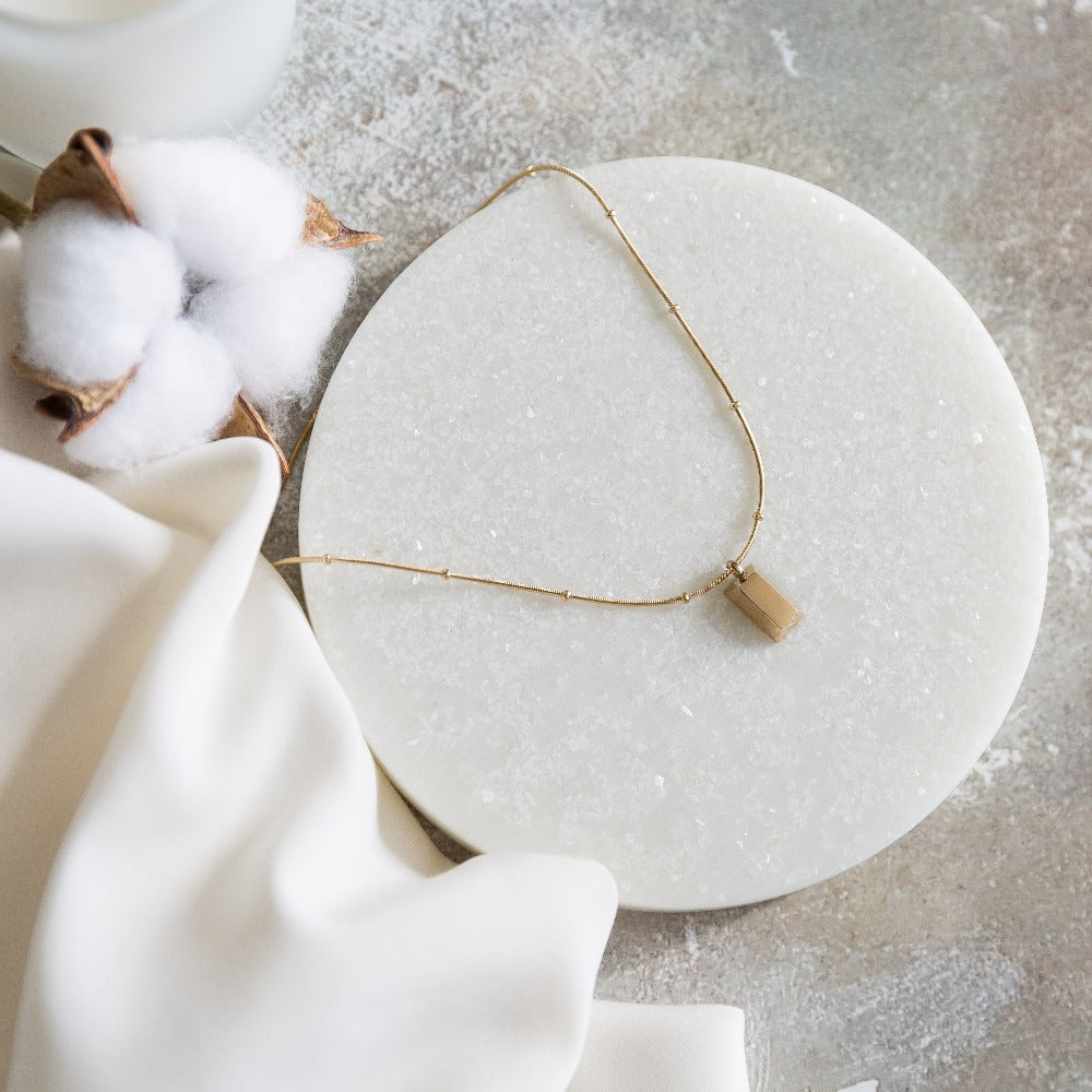 The Gold Brick Necklace for Women, part of the new jewelry collection from Arvo, features a delicate beaded chain and simple bar charm that combine to form a minimalist accessory that is perfect for casual or dress up occasions.