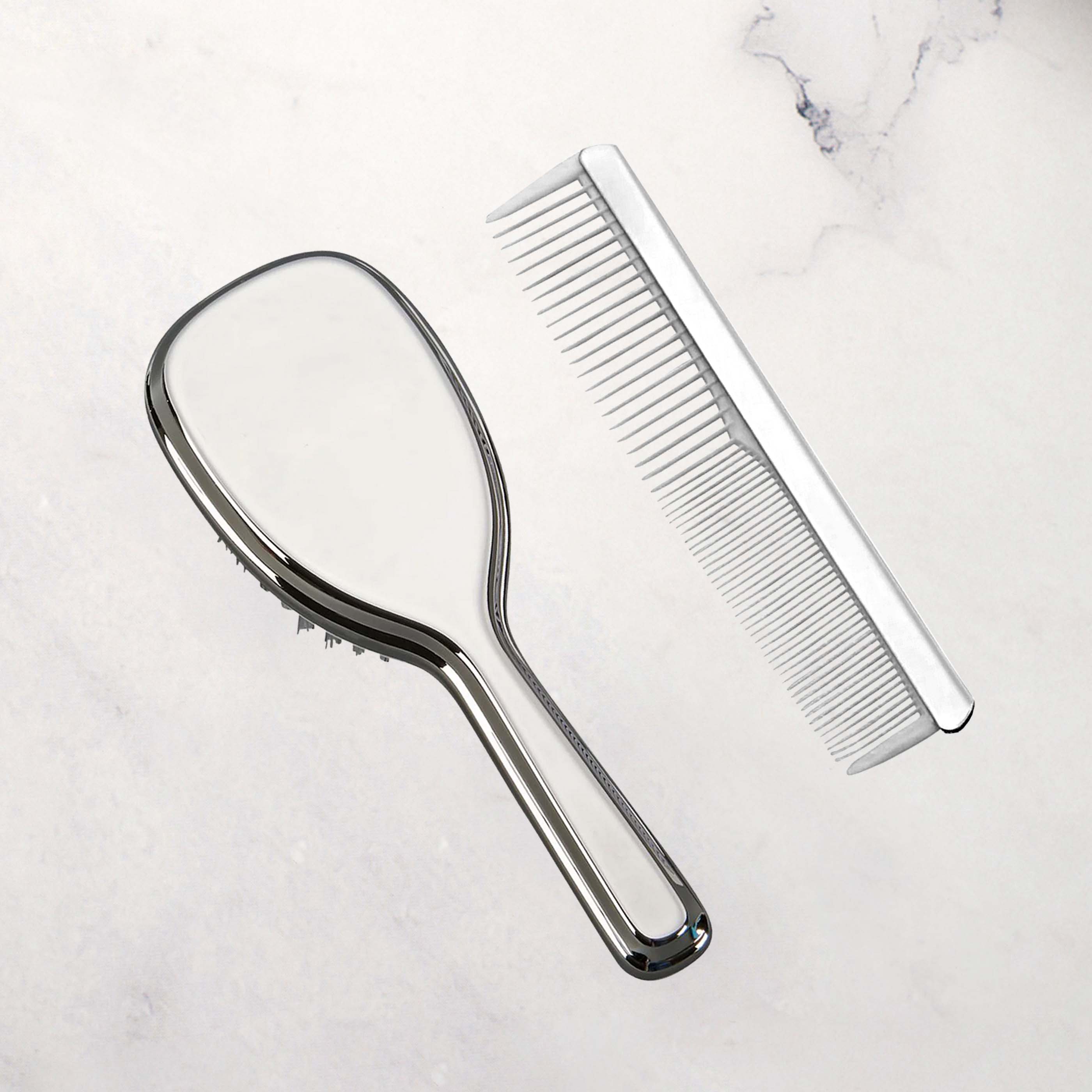 Help your little one look like a star with our classic comb and brush set. The set is produced in a non-tarnish bright nickel plated finish. The comb is 4.75" L and has white "teeth". The brush has an elegant handle and measures 6" x 2.125". If you wanted to add an engraving, the optimum engraving area is 3" x 2/125" and is totally flat. Sheridan photo gift box.