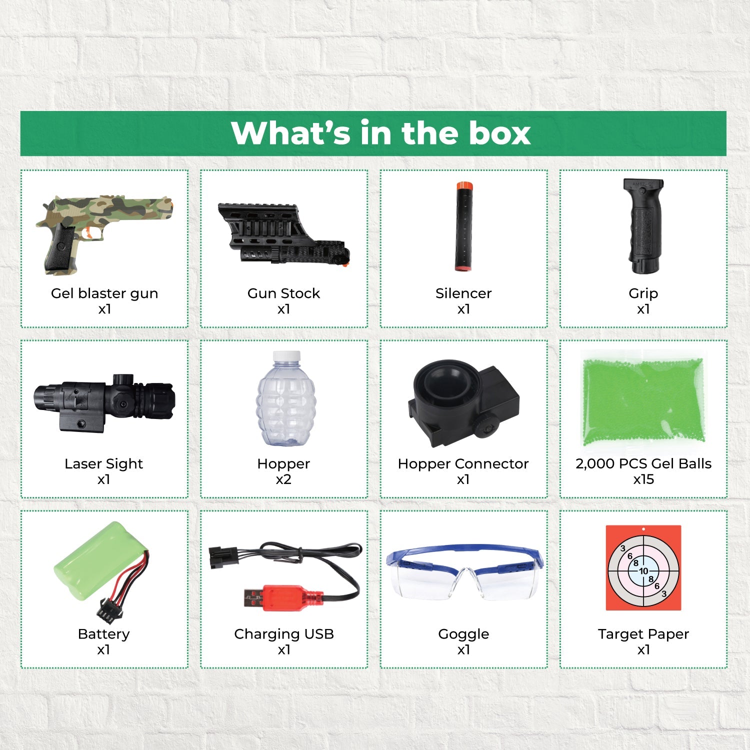 • But that's not all - the Contixo GB1 Automatic Gel Ball Blaster Battle Ready Kit has your back! It's packed with all the essentials for your EPIC battles. You'll receive a fully charged Gel Ball Blaster Gun, a fast charging cable for up to 4 HOURS of playtime, a gravity-fed hopper holding 500 Gel Balls, and a Grip & Laser Guide for unbeatable accuracy. Plus, we've got you covered with a pair of safety goggles and a 15-pack of 2000 pre-hydrated gel beads - because safety and fun go hand in hand!