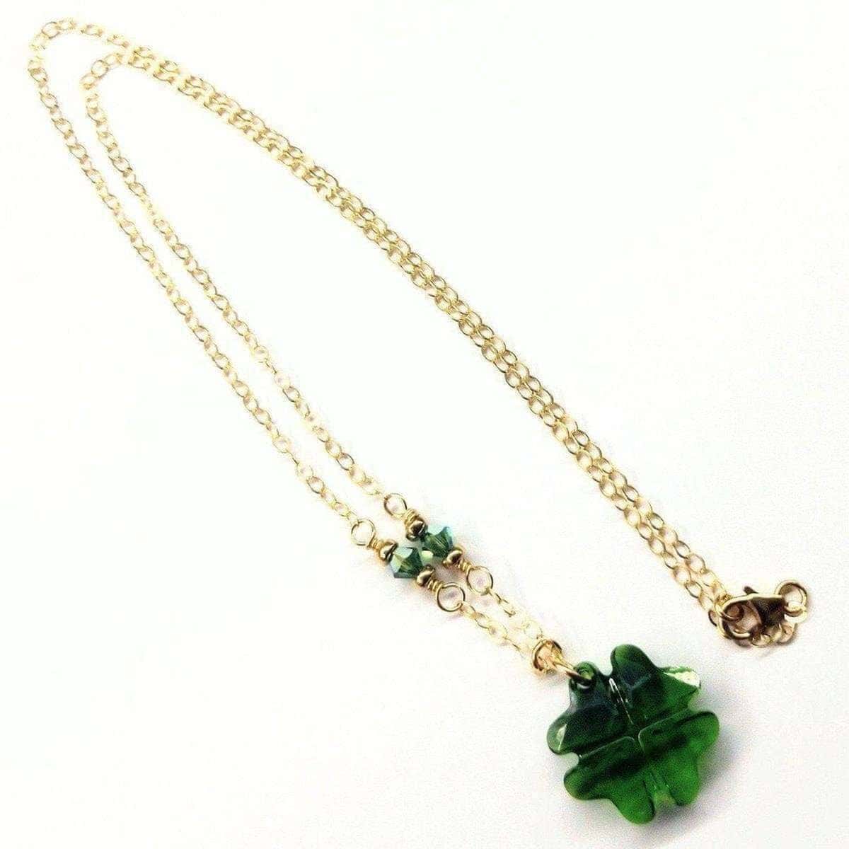 Fulfilled by our friends at Alexa Martha Designs Fall in love with this beautiful handmade wire-wrapped dark green crystal lucky clover necklace! The stunning shamrock pendant features an alluring Erinite dark green Swarovski Crystal Carved Clover bead, which dangles from a sophisticated 14 kt goldfilled sparkle flat cable chain. Plus, adorning...