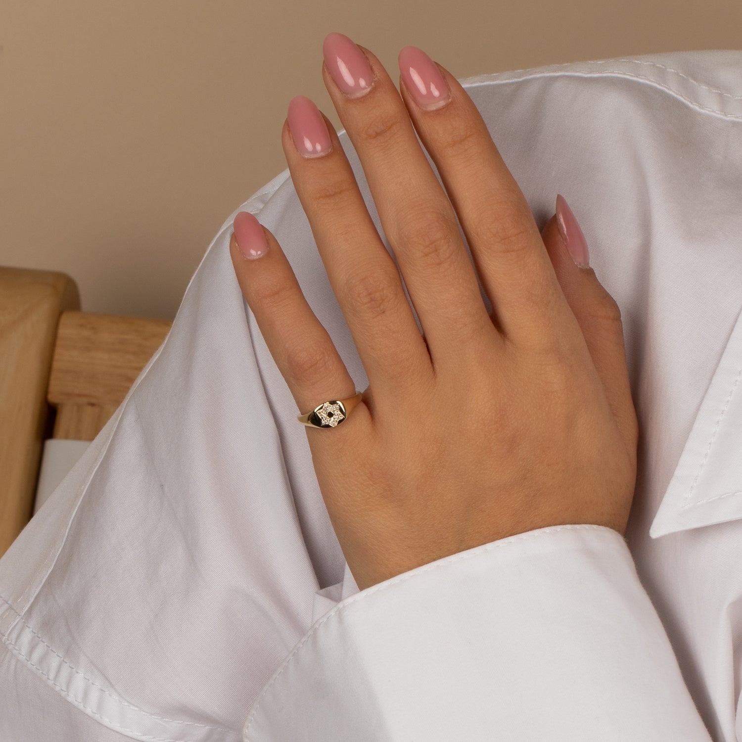 Discover a modern twist on a classic symbol with the Diamond Pave Star Of David Signet Ring. Made from 14K gold, this striking signet ring features a pave setting of round brilliant-cut natural diamonds, totaling 0.06 carats, to illuminate the Star of David with a sophisticated sparkle. Available in sizes 3 and 4, it’s a perfect blend of spiritual significance and contemporary style, ideal for those who appreciate both elegance and meaning.