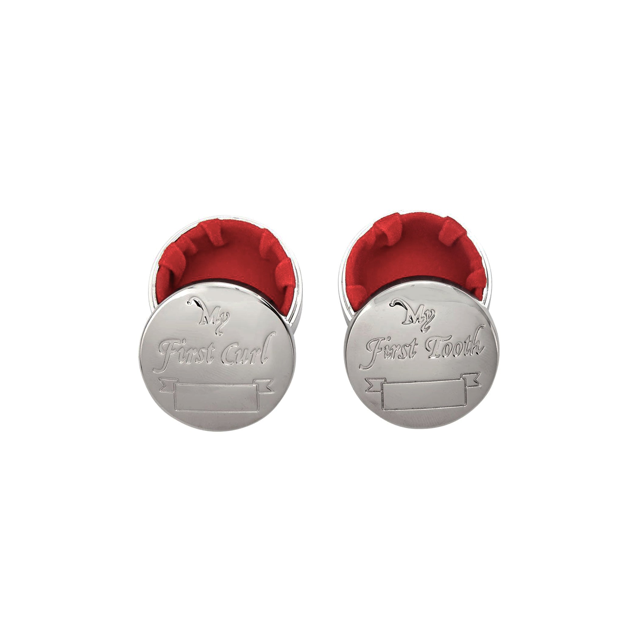 Our First Curl and First Tooth Box Set is a traditional keepsake gift done in a round design with My First Curl and My First Tooth engraved on the top of each box with a .875" x .25" area left open to add your optional personalization. The set is made in a non-tarnish nickel plated finish. This Engraved First Curl and Tooth Set makes a unique gift for a child's birthday, baptism or christening keepsake. Each box has a lift top lid and measures 1.625" x 1.625" x .75". The inside of each box is lined with a red velvet lining. Silver gift box.