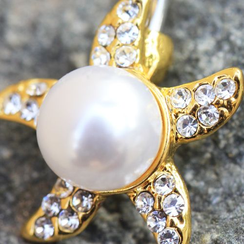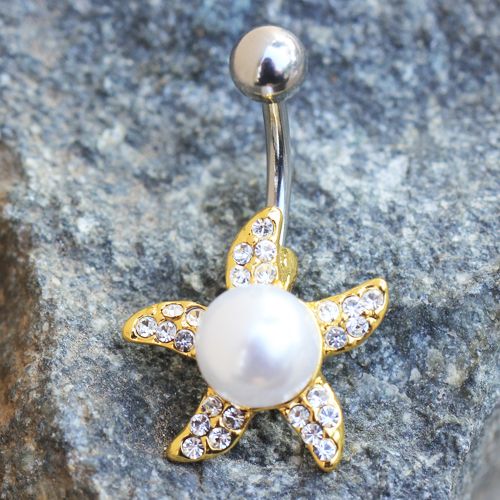 Fulfilled by our friends at Fashion Hut Jewelry• Belly Button Ring / Navel Ring with Starfish Design• Rich Yellow gold plated jewelry• Large White Synthetic Pearl in the center• Multiple Clear CZ on the Starfish• Bar Thickness : 14GA | 1.6mm• Bar Length : 3/8" | 10mm• Starfish Size :...