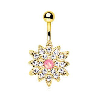 Fulfilled by our friends at Fashion Hut JewelryThis Gold Plated Navel Ring / Belly Button Ring is a beautiful sunburst flower design, accentuated by 18 round Cubic Zirconia and a central Pink Synthetic Opal. Crafted from Gold Plated 316L Stainless Steel, Zinc Alloy, Cubic Zirconia, and Synthetic Opal, the bar...