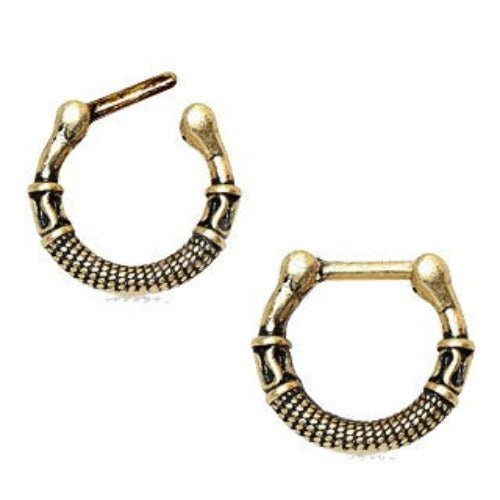 Fulfilled by our friends at Fashion Hut JewelryGreek Inspired Antique Gold Plated Septum Clicker This jewelry is beautiful, unisex friendly, with unique Greek inspired jewelry design. Clicker bar is crafted out of 316L Surgical Steel while the rest of the body is plated copper. All plated in gold with an...