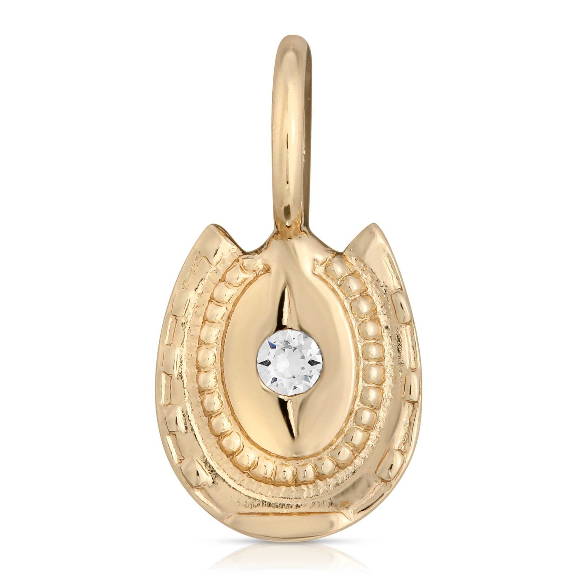 Fulfilled by our friends at eklexicHarlow Charm is recycled brass plated 14K GoldHorseshoe measures .5"Center stone is Swarovski CrystalHandmade in the USA