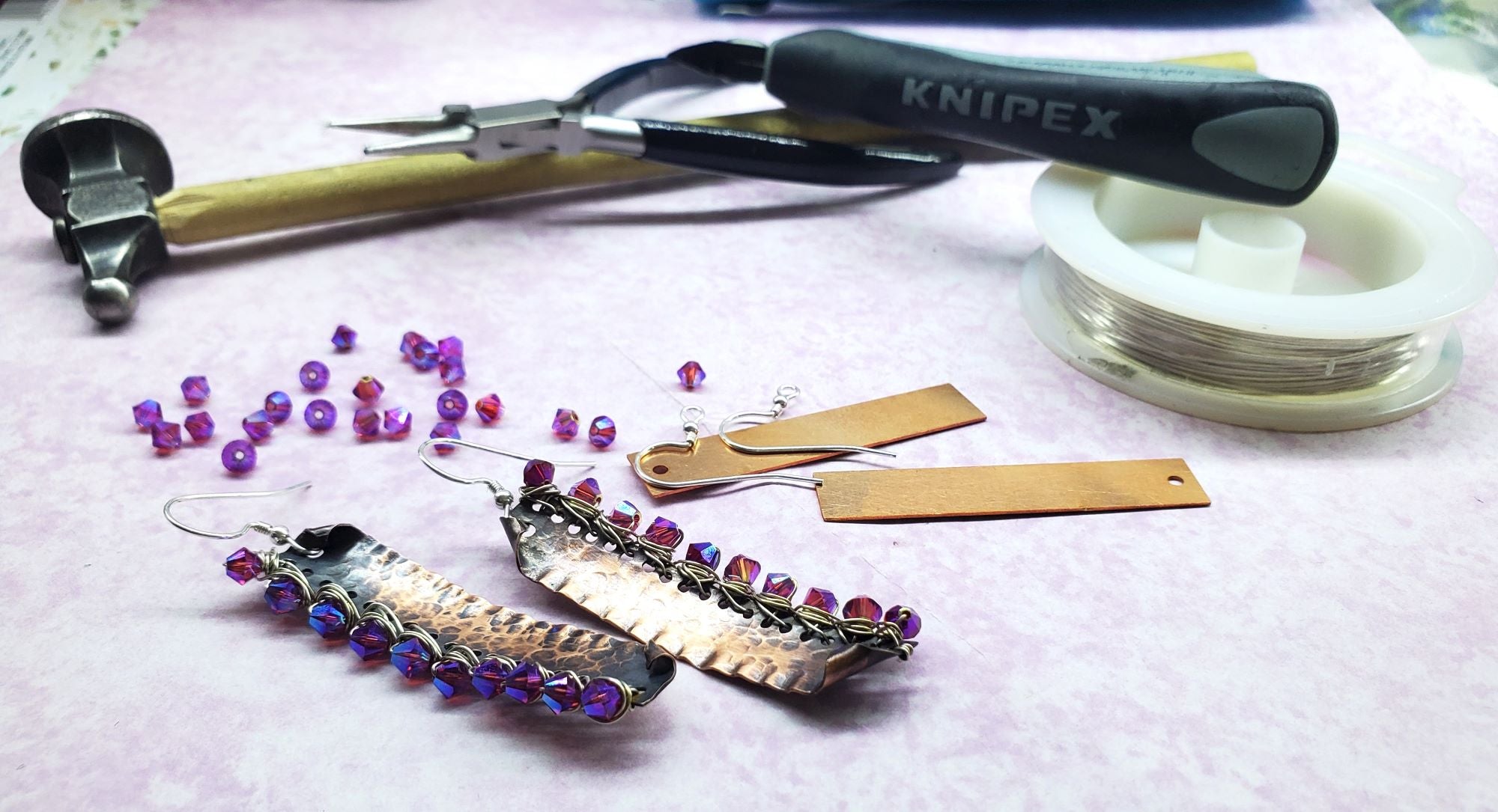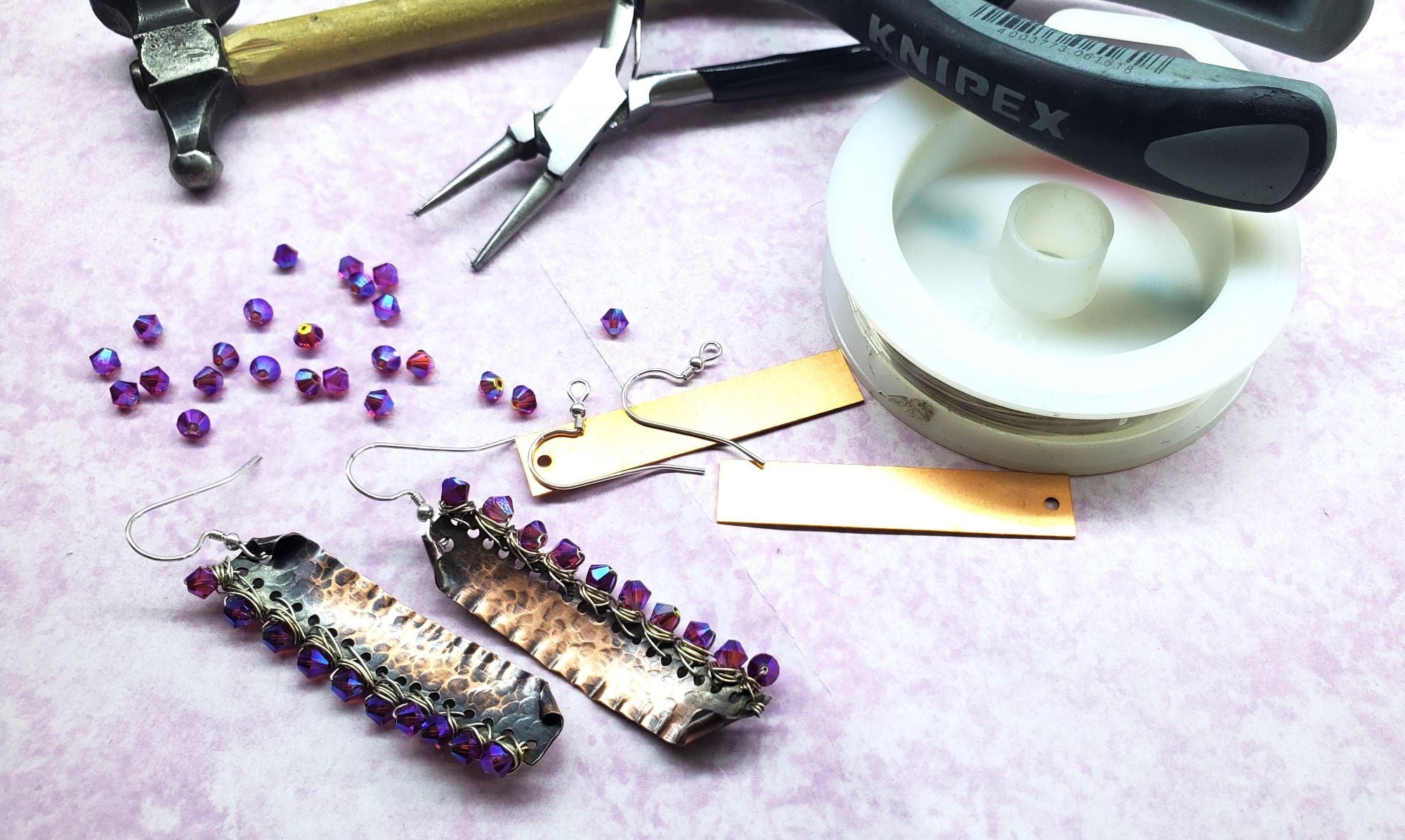 Add a lot of sparkle and style to any outfit with my wire-wrapped Super Sparkly Hot Pink Hammered Copper Bar Earrings. Handcrafted with care, these earrings are made from 24 gauge copper bars that are patterned with a special hammer and wire-wrapped with sterling silver wire super sparkly Fuchsia ABx2 Swarovski crystals and sterling silver wire. Embrace your individuality with these one-of-a-kind earrings! The other side of the earrings I crimp with pliers and curl the edges to make it smooth. The earrings are then antiqued to show the hammering work and the crimping. The earrings are about 1/2 inch wide and just about 3 inches long.
