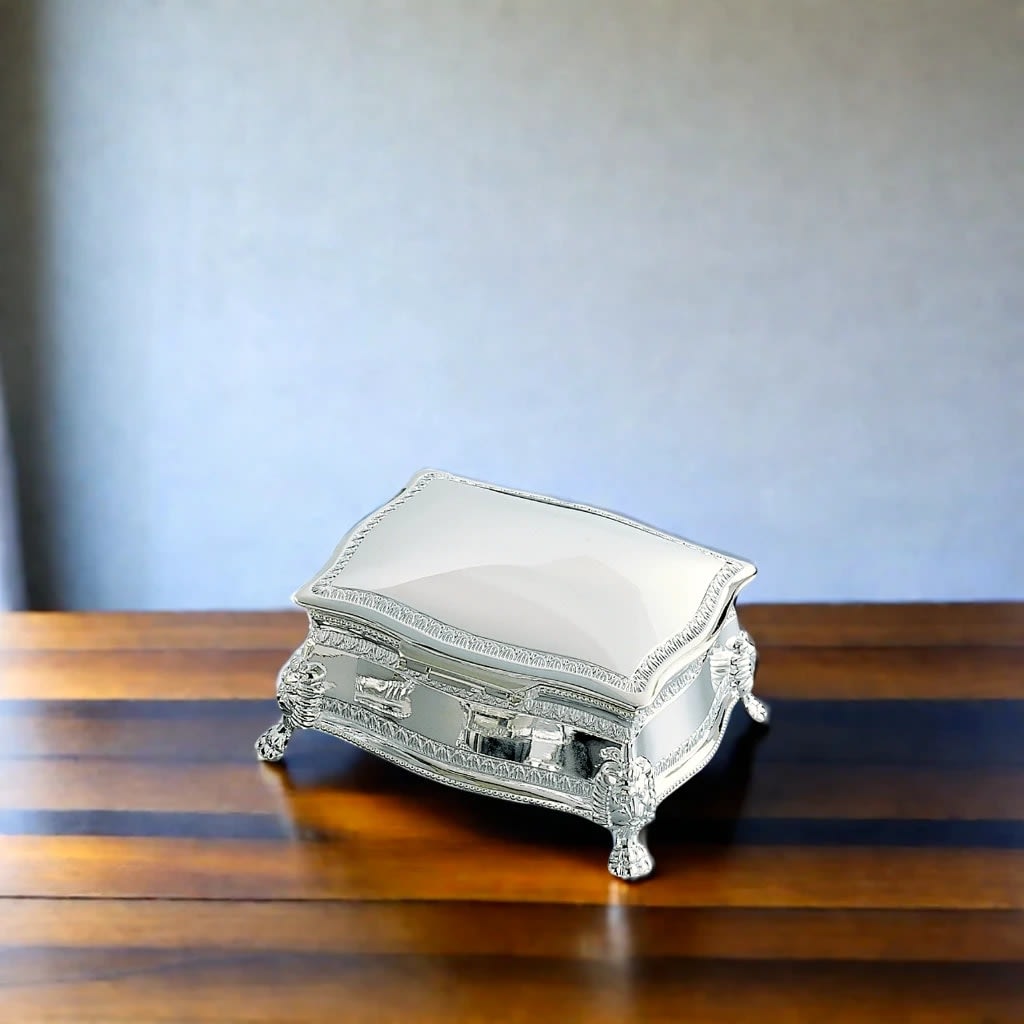 This elegant 6" x 5" "Figaro" box is plated with nickel to give the box a shiny silver look that will not tarnish. The cover is hinged and has a scroll design imbedded inside the cover. The bottom of the box is lined with a dark blue flocked cloth lining. The cover can be engraved with a monogram to personalize this gift. The box has 4 feet with a lion head design at the top of each of the 4 feet. White gift box.