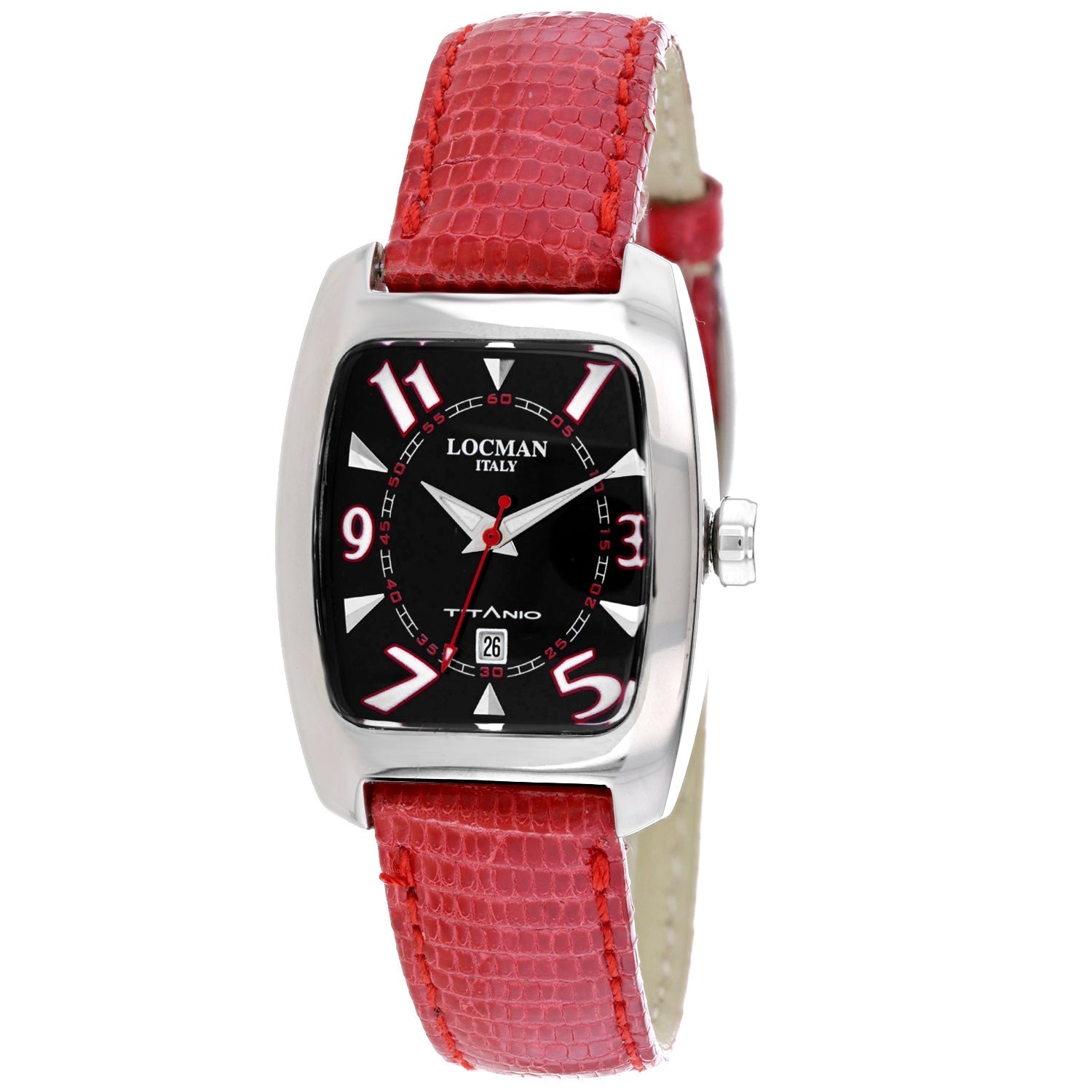 Titanium case, Leather strap, Black dial, Quartz movement, Scratch resistant mineral, Water resistant up to 3 ATM - 30 meters - 100 feet