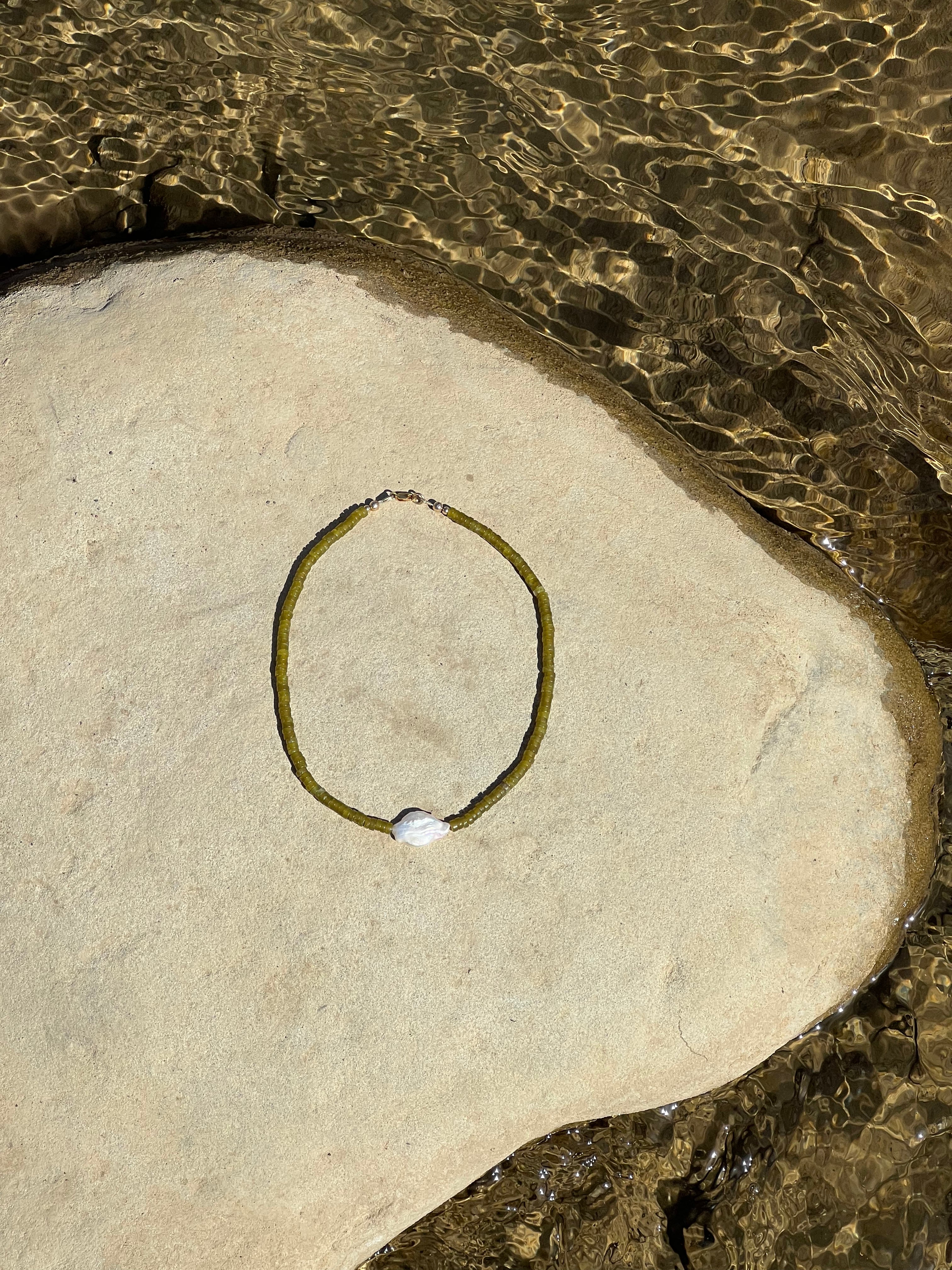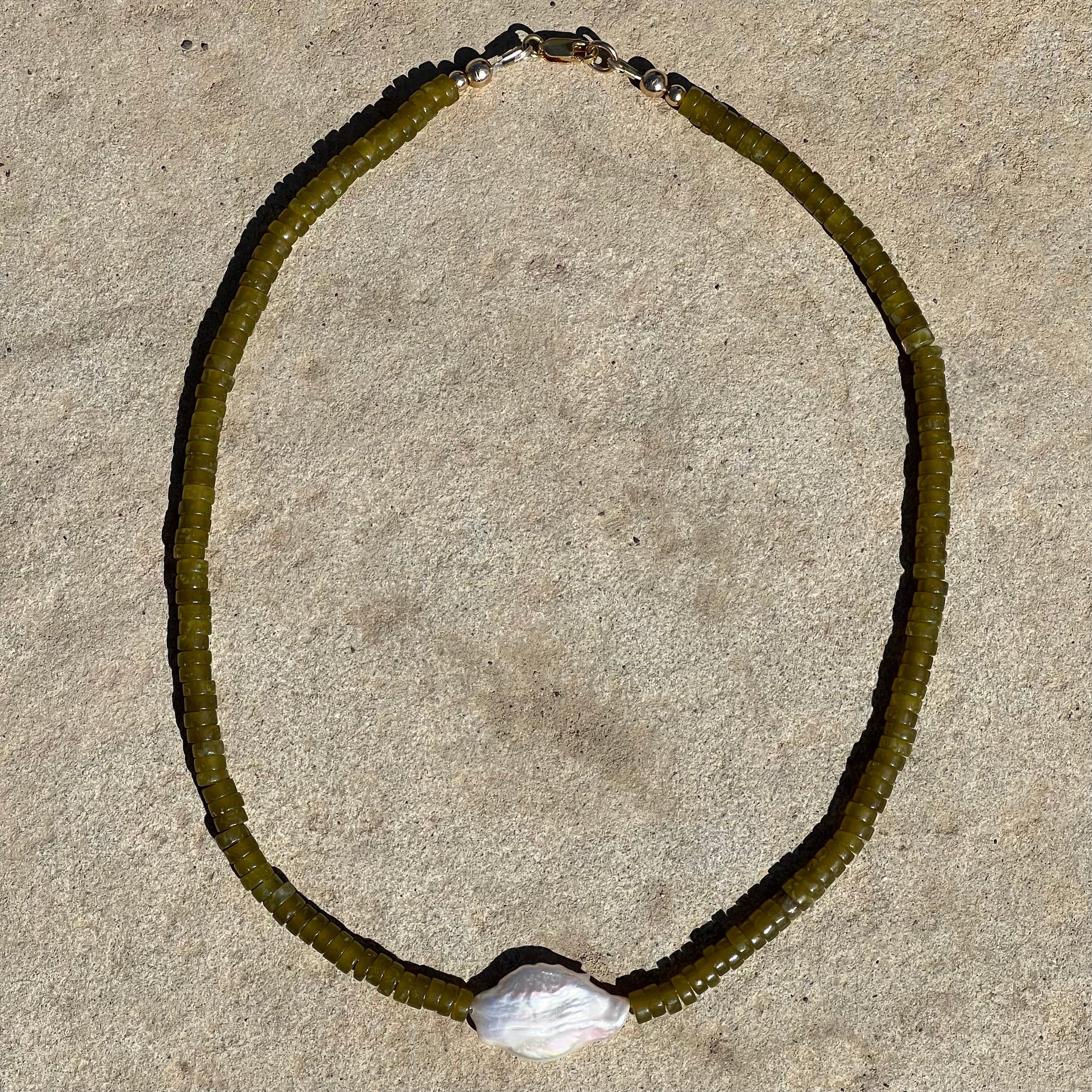 Inspired by the colors of Ojai. Featuring jade gemstones and a baroque pearl that grounds and invites you to reconnect with nature. Due to the nature of handmade and natural materials, each one will be unique and one of a kind.