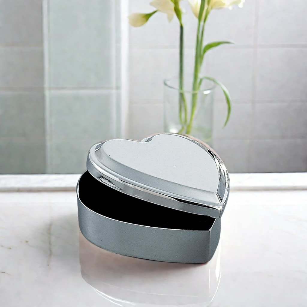 Fulfilled by our friends at Creative GiftsThis beautiful 3.25" x 3.5" heart shaped box is plated with nickel to give the box a shiny silver look that will not tarnish. The cover can be engraved with a monogram to personalize this gift. The cover lifts off and the inside cover...