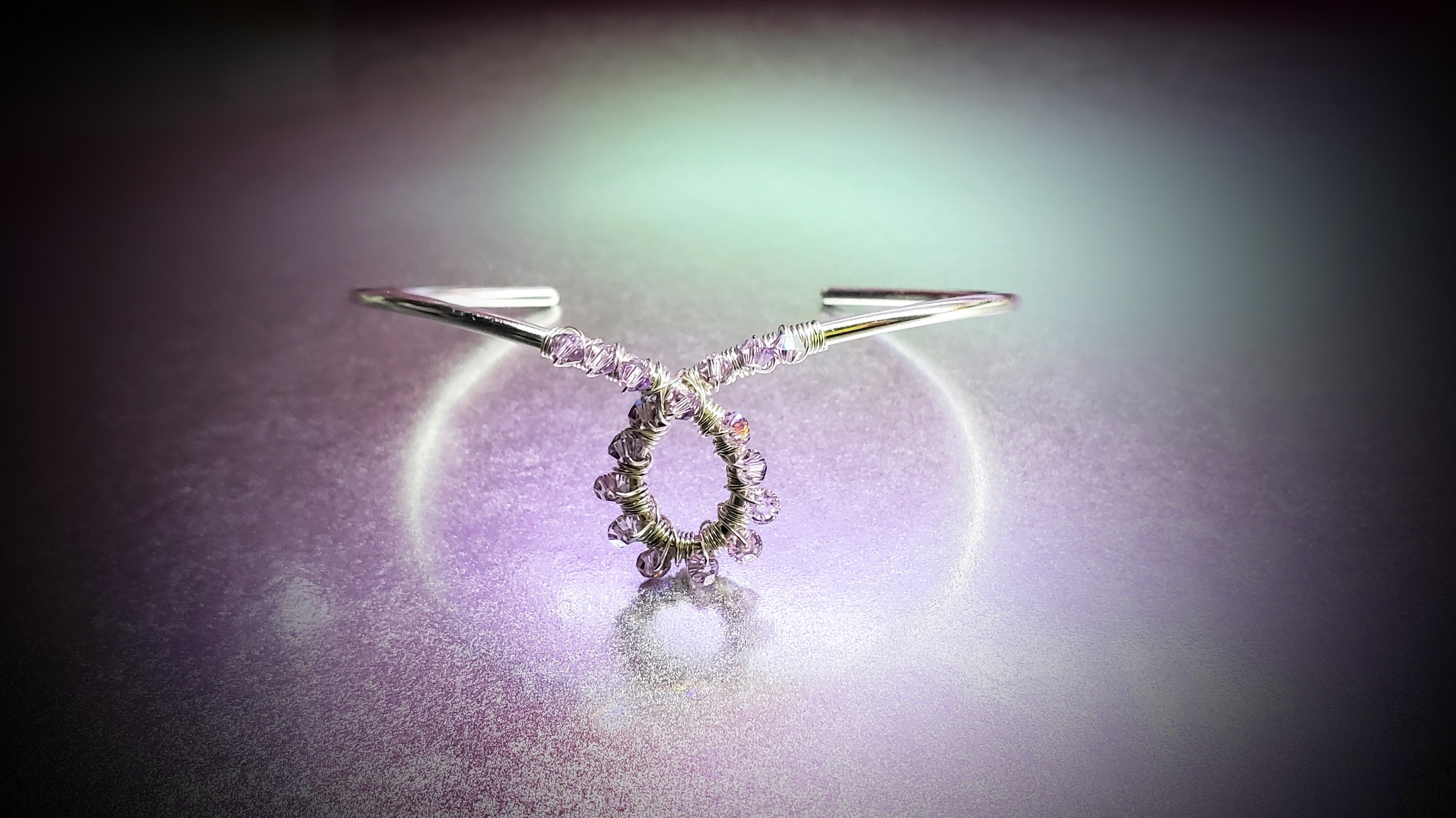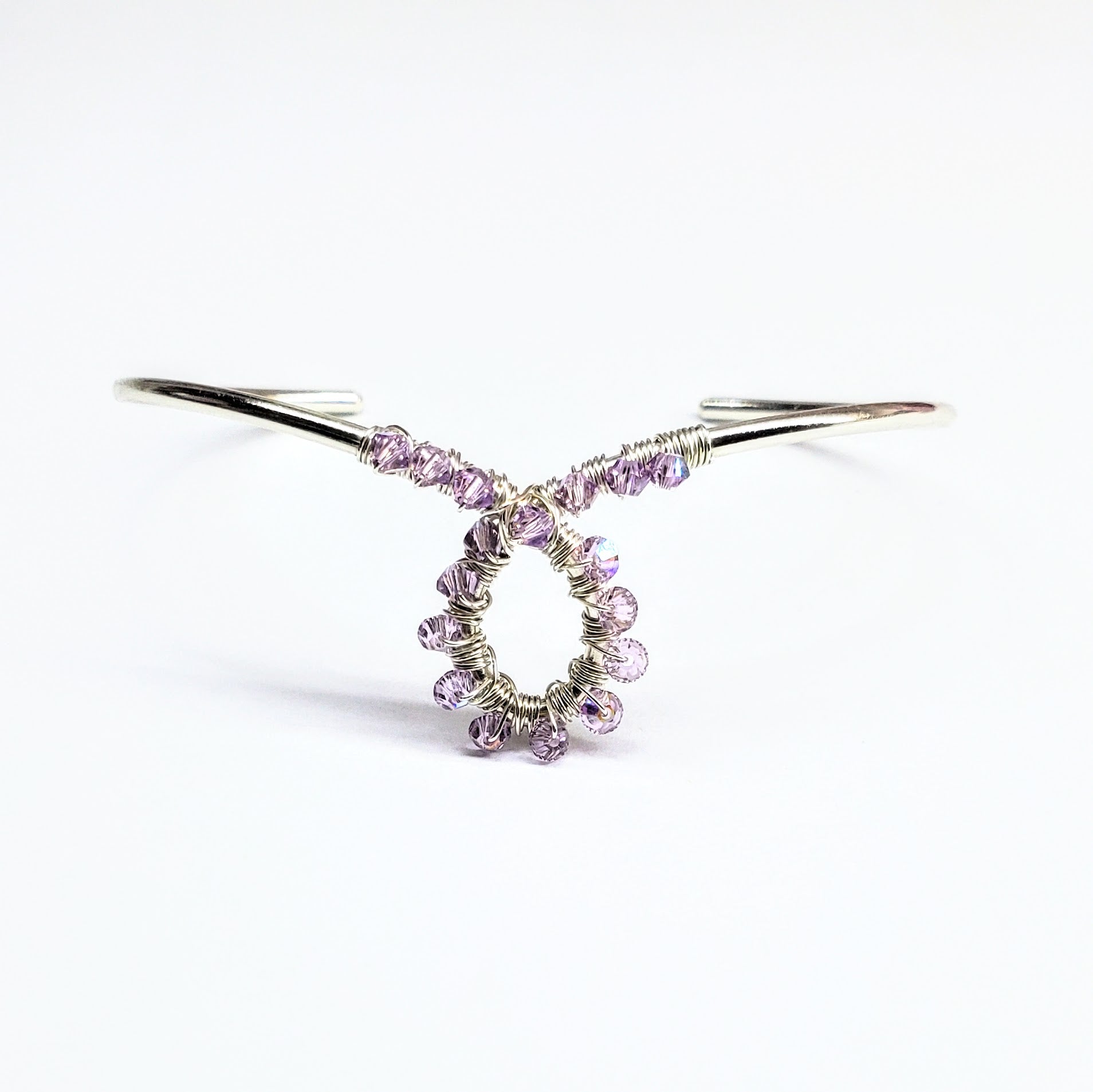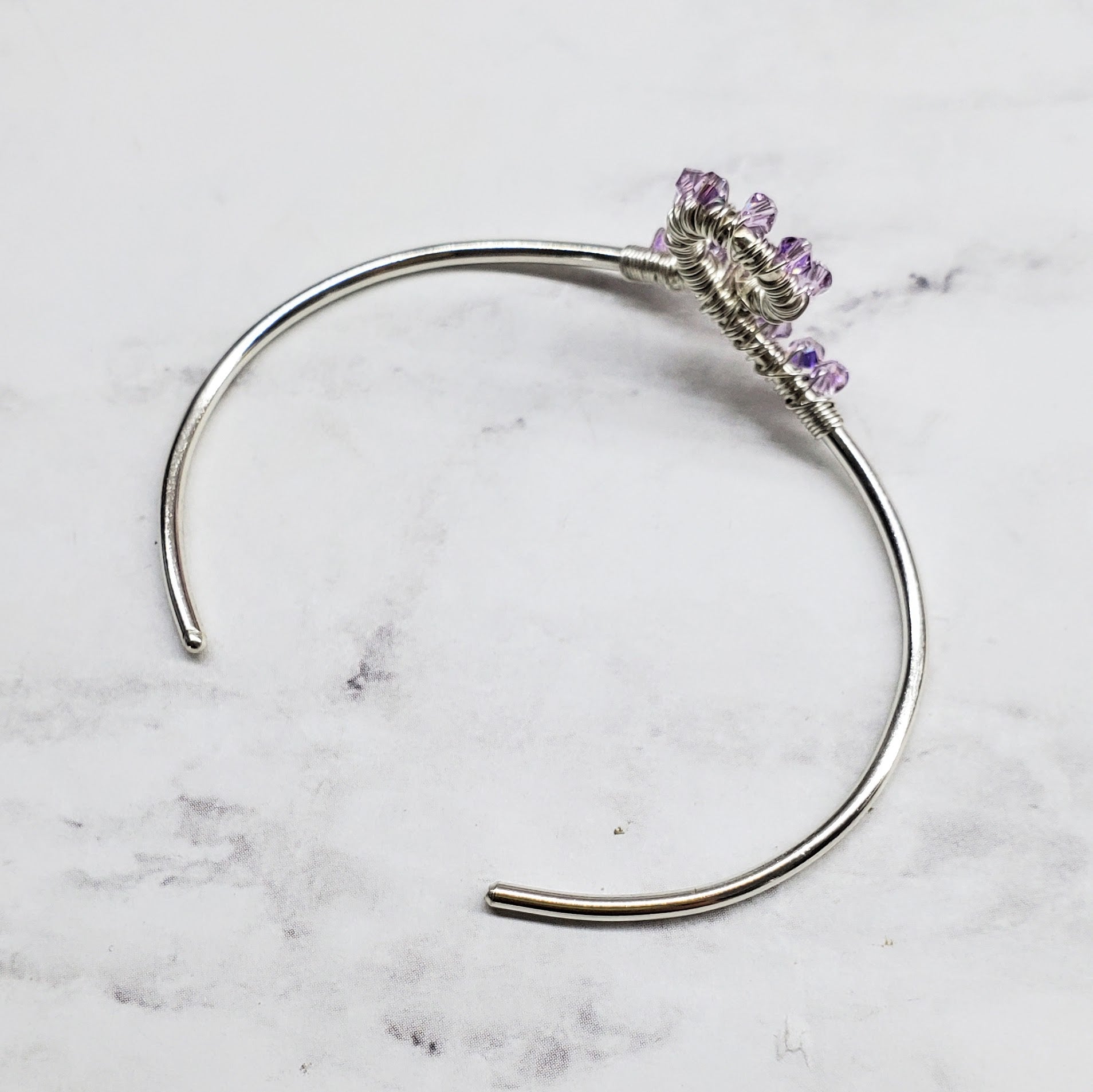First, I carefully select a piece of 12-gauge silver wire and transform it by hand into a stunning ribbon-shaped bangle cuff. Next, I beautifully wire-wrap glimmering lavender Swarovski crystals onto the loop of the bangle using 2 yards of luxurious sterling silver wire, accentuating the elegant curve of the ribbon. This exclusive cuff symbolizes hope and support uniquely. Wear it proudly while championing a cause that resonates with your heart and the hearts of your loved ones. It's designed to sit snugly and comfortably on your wrist!