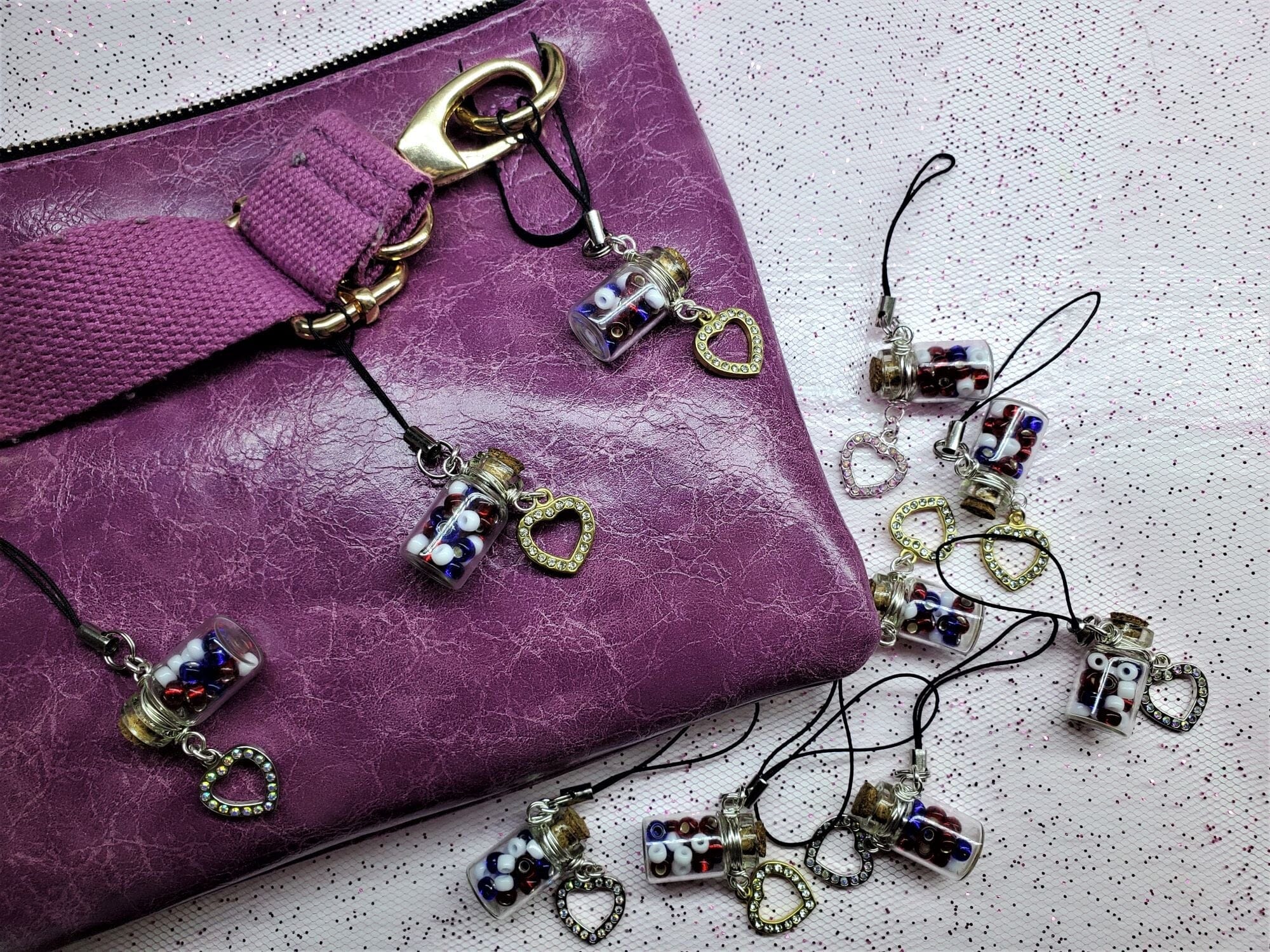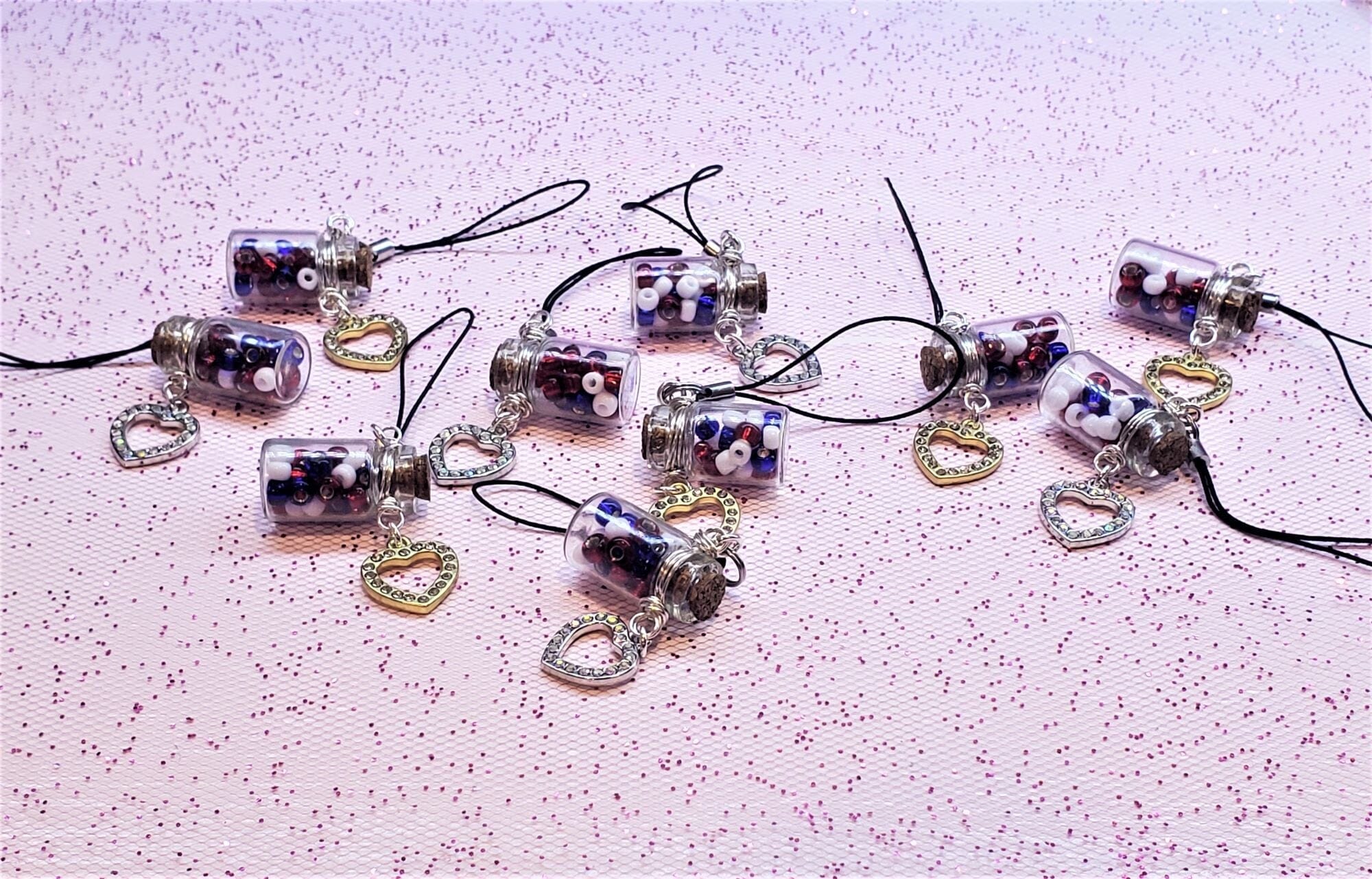 How adorable are these lovely miniature glass bottles not even 2 inch tall and filled with red white and blue patriotic glass gold-lined beads. Each of these miniature-filled glass bottles features a sterling silver wrap around the neck of the bottle with two loops. On one side I attach a loop hook so you can attach it to your purse, shirt button, phone case, etc. On the other side, I add a sparkly Swarovski Crystal Heart Charm to symbolize your Love for the Unites States