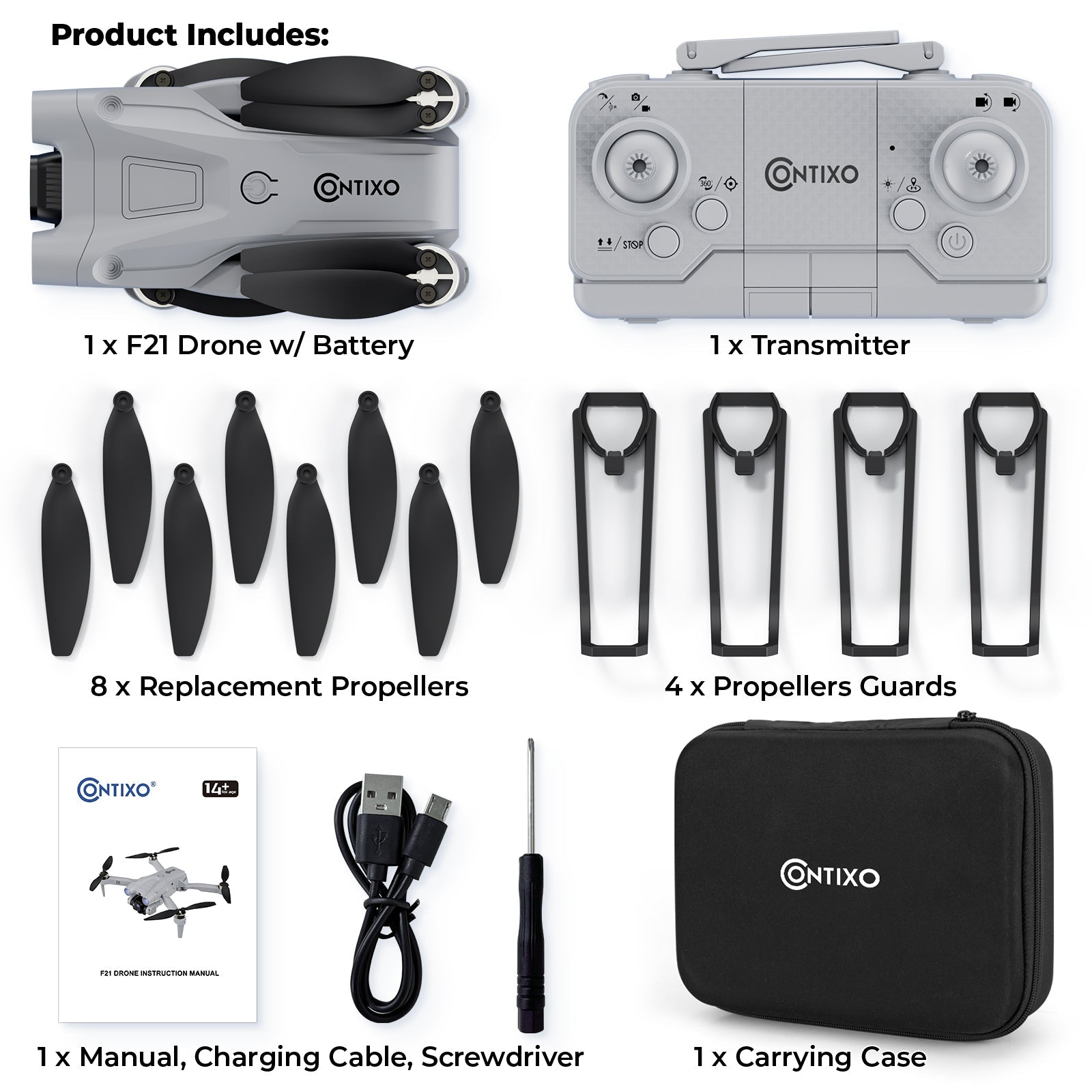- Capture breathtaking photos and videos with an adjustable lens (-90° to 15°) and access real-time views via the "Contixo F21" app.
