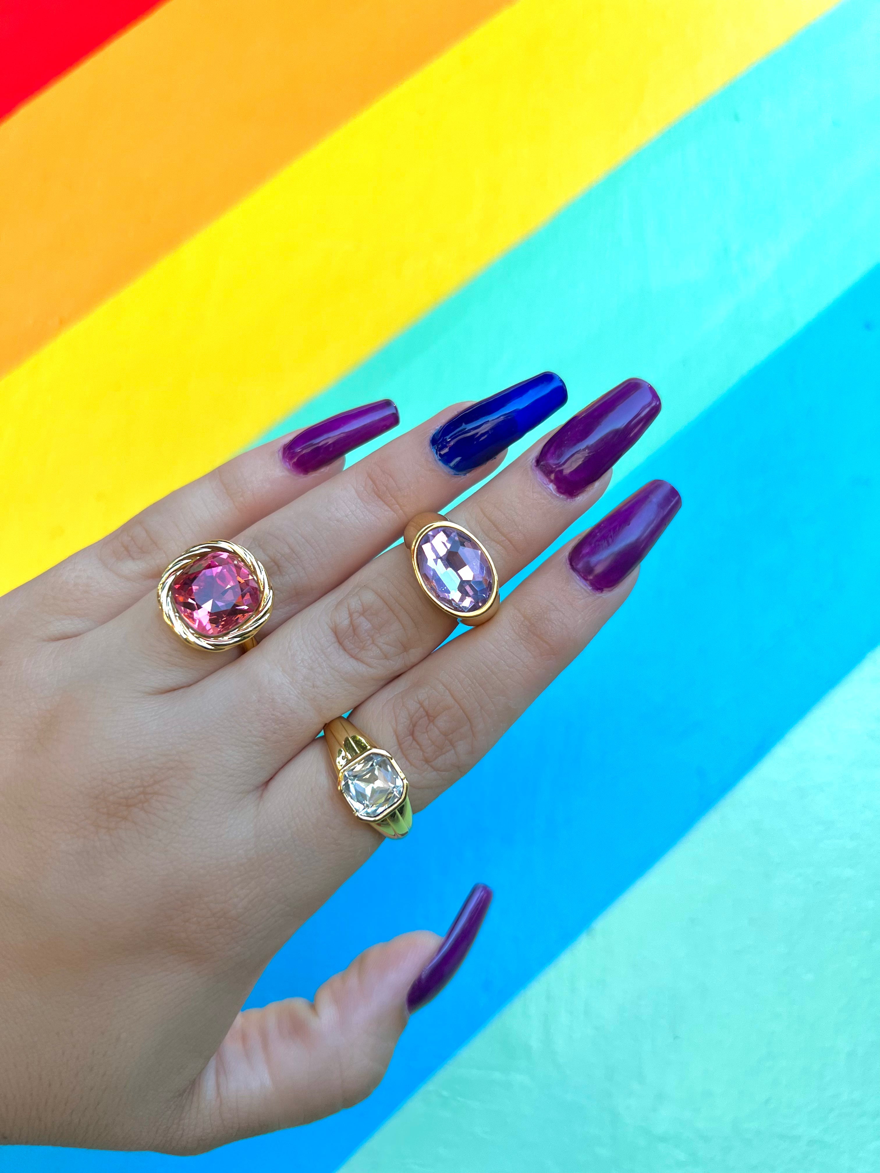 Details: 14K Gold Vermeil with pink swarovski Stone. Braided Gold detail. Wear to a fun party stacked or solo. Day or night.