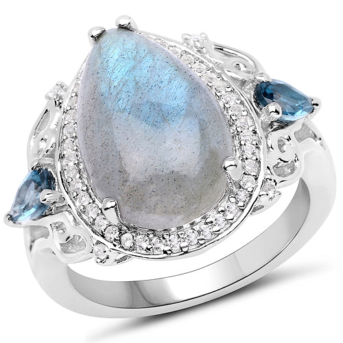 6.18 Carat Genuine Labradorite, London Blue Topaz and White Topaz .925 Sterling Silver Ring