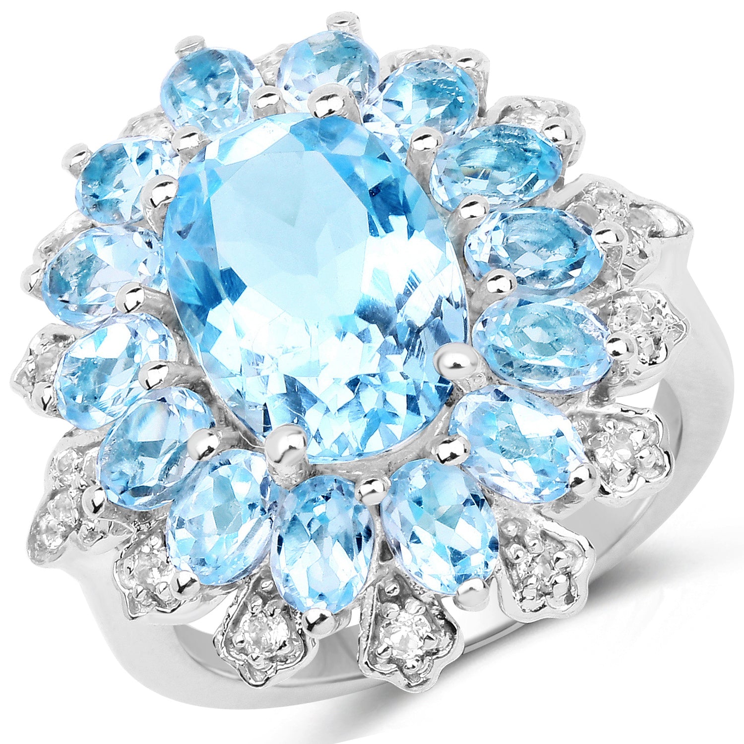 7.57 Carat Genuine Blue Topaz and White Topaz .925 Sterling Silver Ring Topaz Blue:Oval/12x8mm 1/4.59 ct.w + Topaz Blue:Oval/4x3mm 14/2.66 ct.w + Topaz White:Round/1.50mm 12/0.26 ct.w + Topaz White:Round/1.20mm 2/0.02 ct.w + Topaz White:Round/1.00mm 8/0.04 ct.w