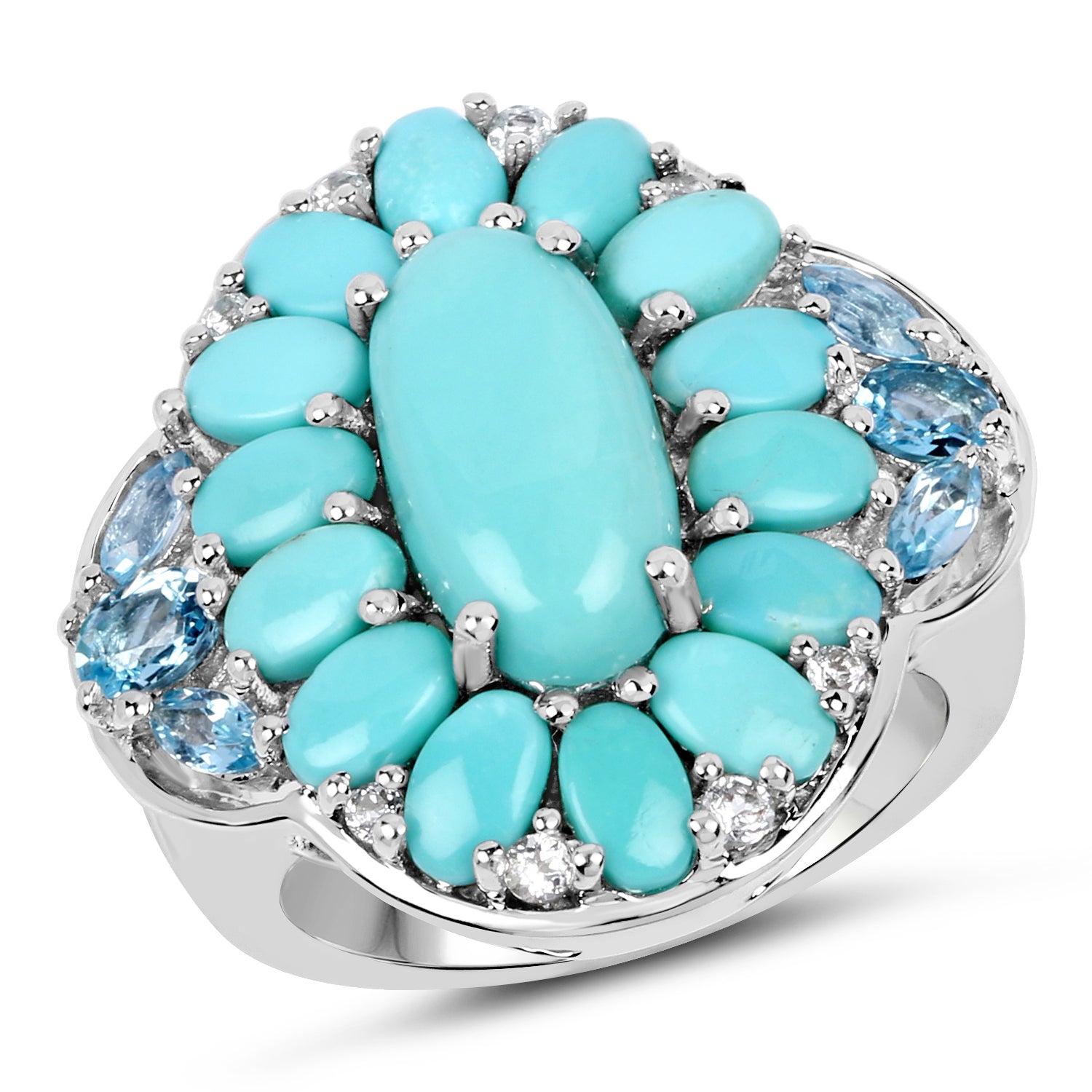8.11 Carat Genuine Turquoise, Swiss Blue Topaz & White Topaz .925 Sterling Silver Ring Turquoise:Oval/13x7mm 1/1.95 ct.w + Turquoise:Oval/5x3mm 14/5.18 ct.w + Blue Topaz(Swiss):Oval/4x3mm + Blue Topaz(Swiss):Marquise/4x2mm + Topaz White:Round/1.80mm 4/0.13 ct.w + Topaz White:Round/1.50mm 4/0.09 ct.w