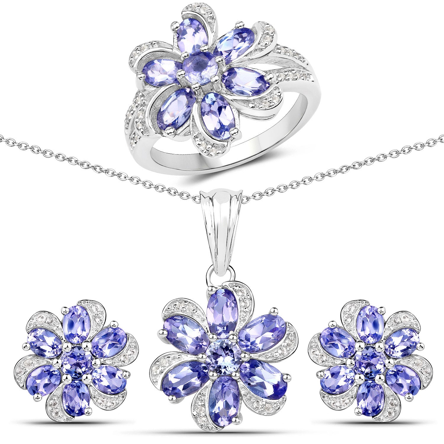 8.28 Carat Genuine Tanzanite & White Topaz .925 Silver 3 Pc Jewelry Set Ring Earring & Pendant Chain