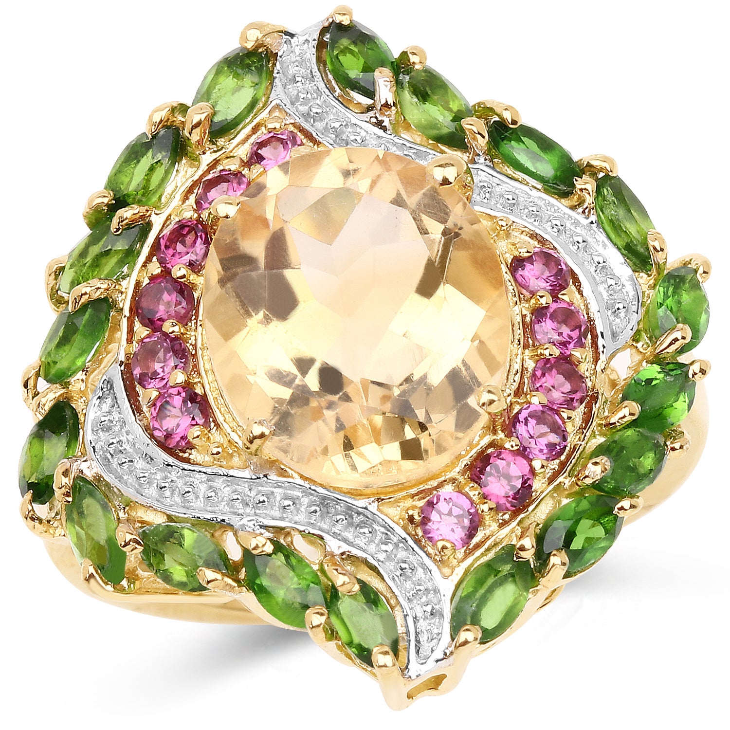 14K Yellow Gold Plate 6.11 Carat Genuine Citrine Rhodolite & Chrome Diopside .925 Silver Ring