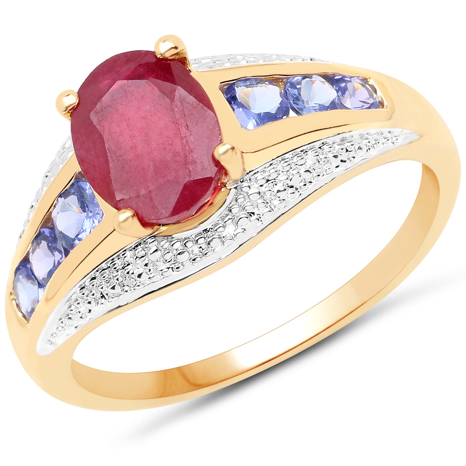 14K Yellow Gold Plated 2.02 Carat Glass Filled Ruby and Tanzanite .925 Sterling Silver Ring Ruby Glass Filled:Oval/8x6mm 1/1.60 ct.w + Tanzanite:Round/2.70mm 2/0.16 ct.w + Tanzanite:Round/2.30mm 2/0.12 ct.w + Tanzanite:Round/2.50mm 2/0.14 ct.w