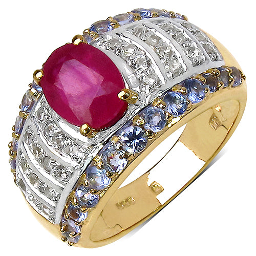 14K Yellow Gold Plated 3.02 Carat Genuine Ruby, Tanzanite & White Topaz .925 Sterling Silver Ring